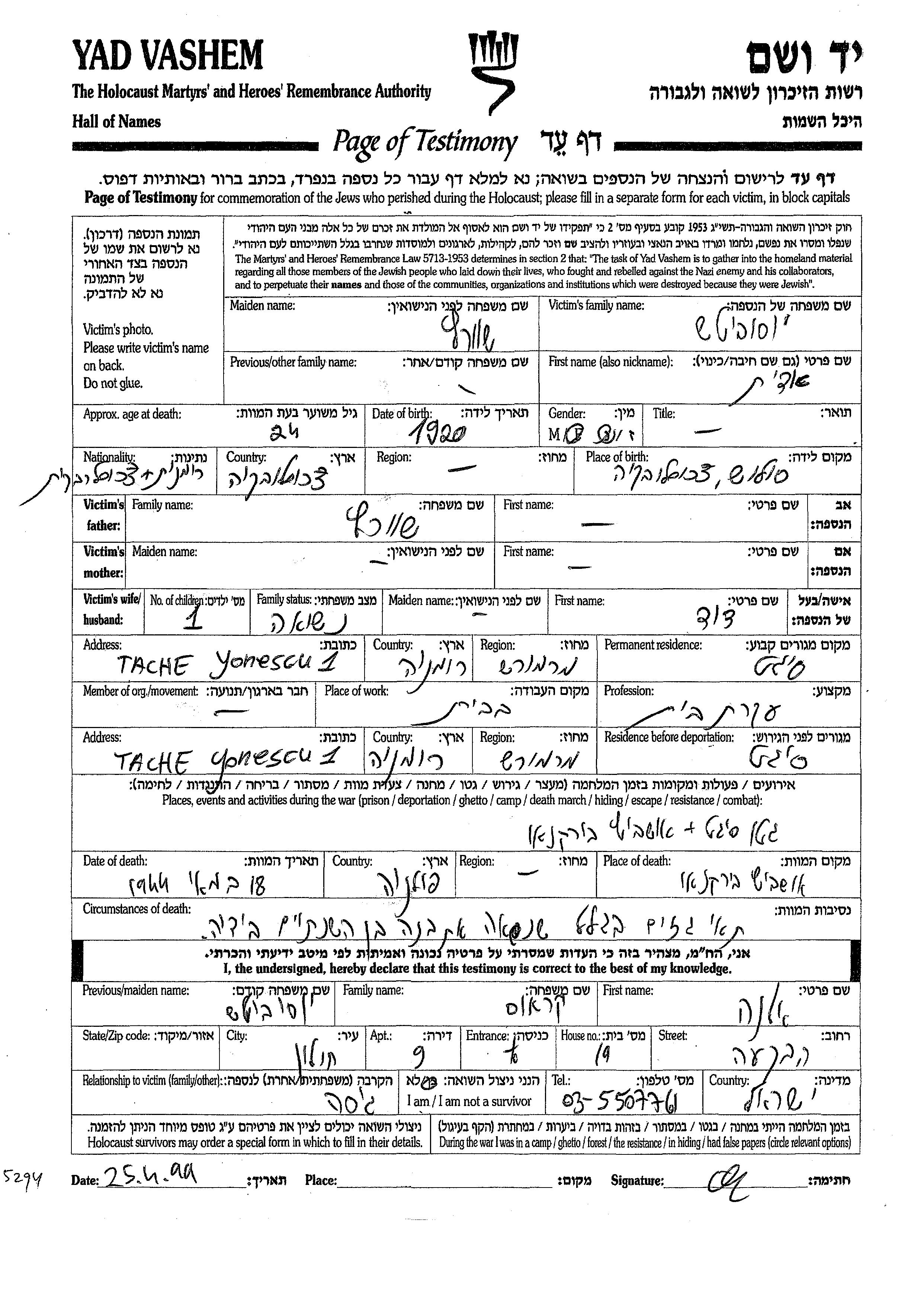 Yad Vashem - Pages of Testimony Names Memorial Collection