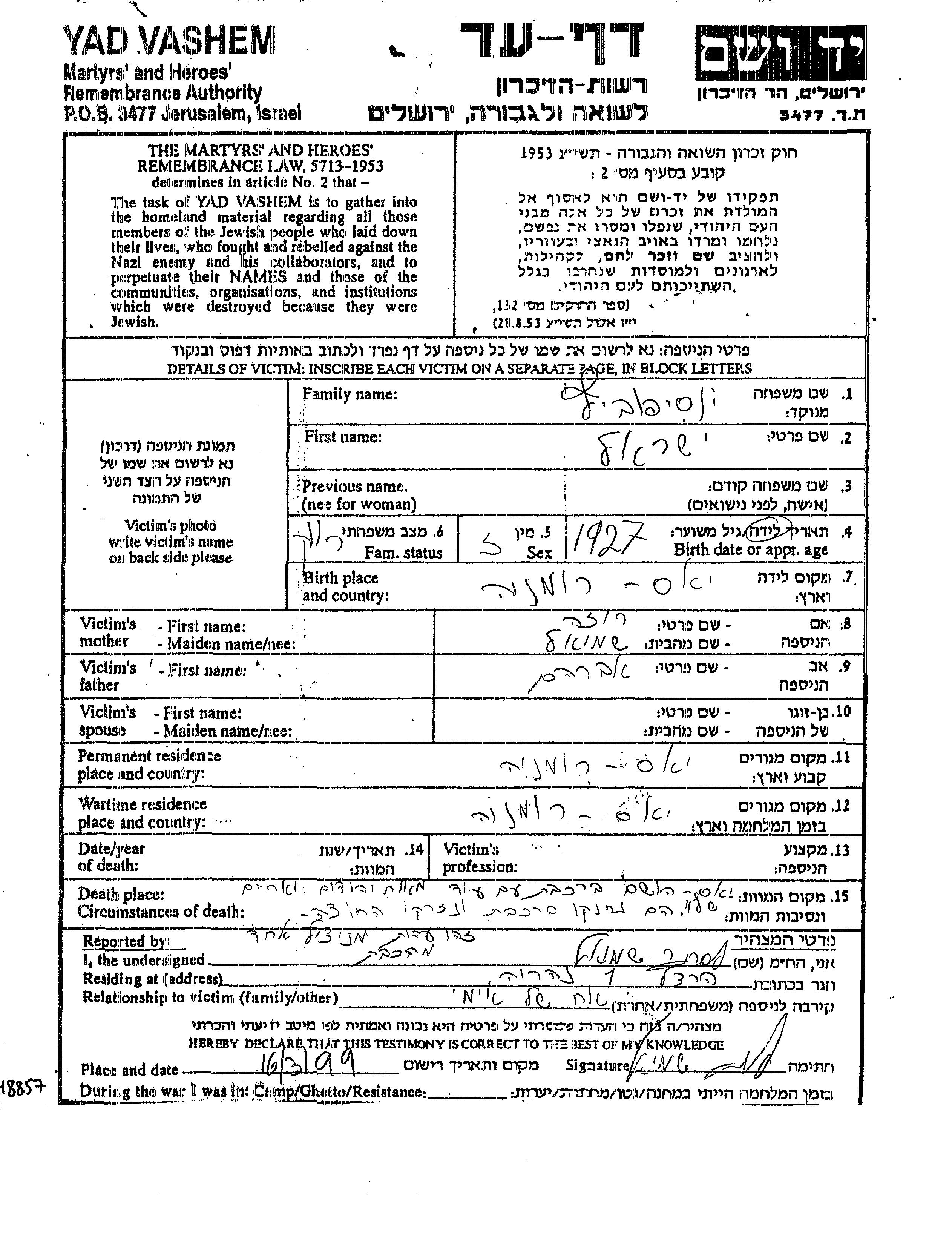 Iosipovich Yisrael 1927 Iasi, Roumanie Feuille de témoignage