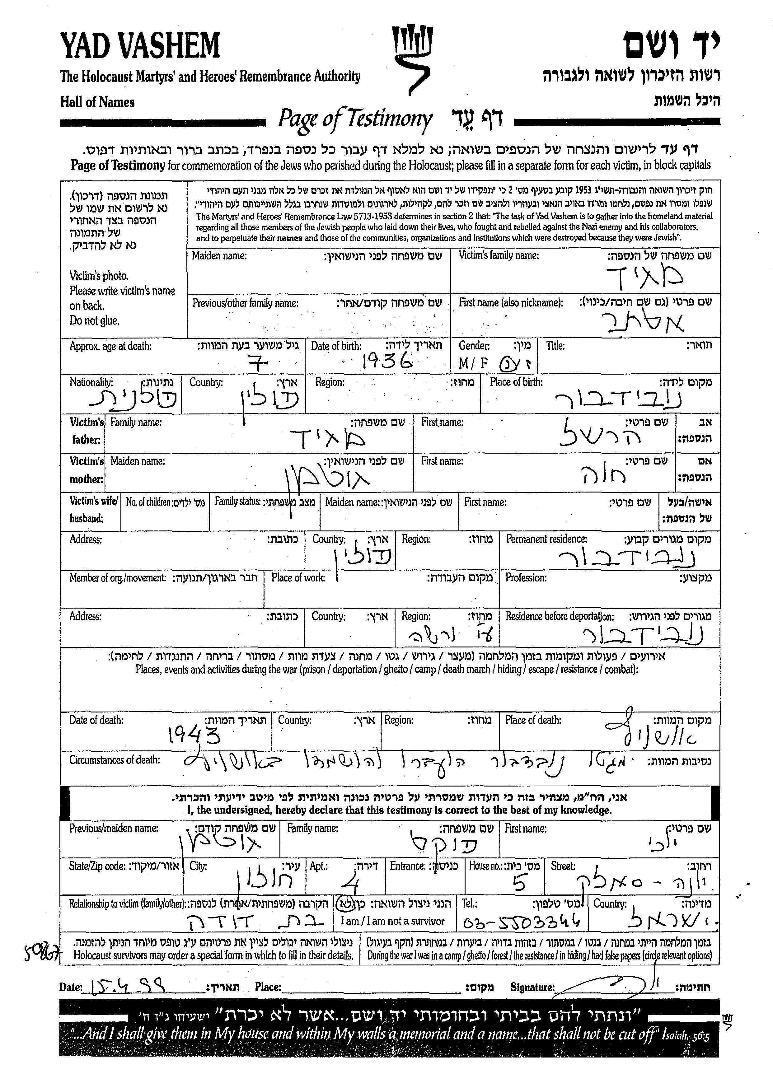 Yad Vashem - Pages of Testimony Names Memorial Collection