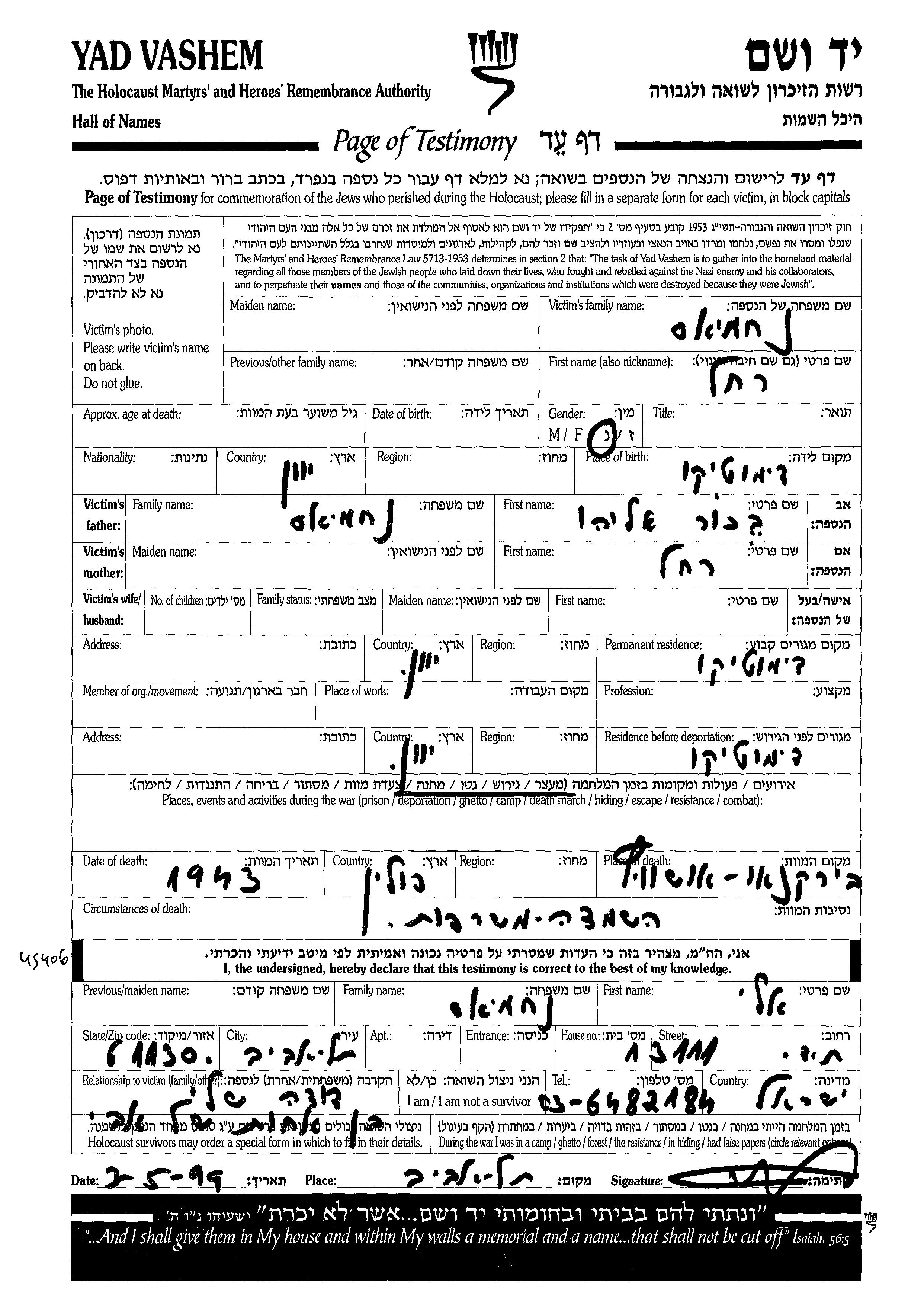 Yad Vashem - Pages of Testimony Names Memorial Collection