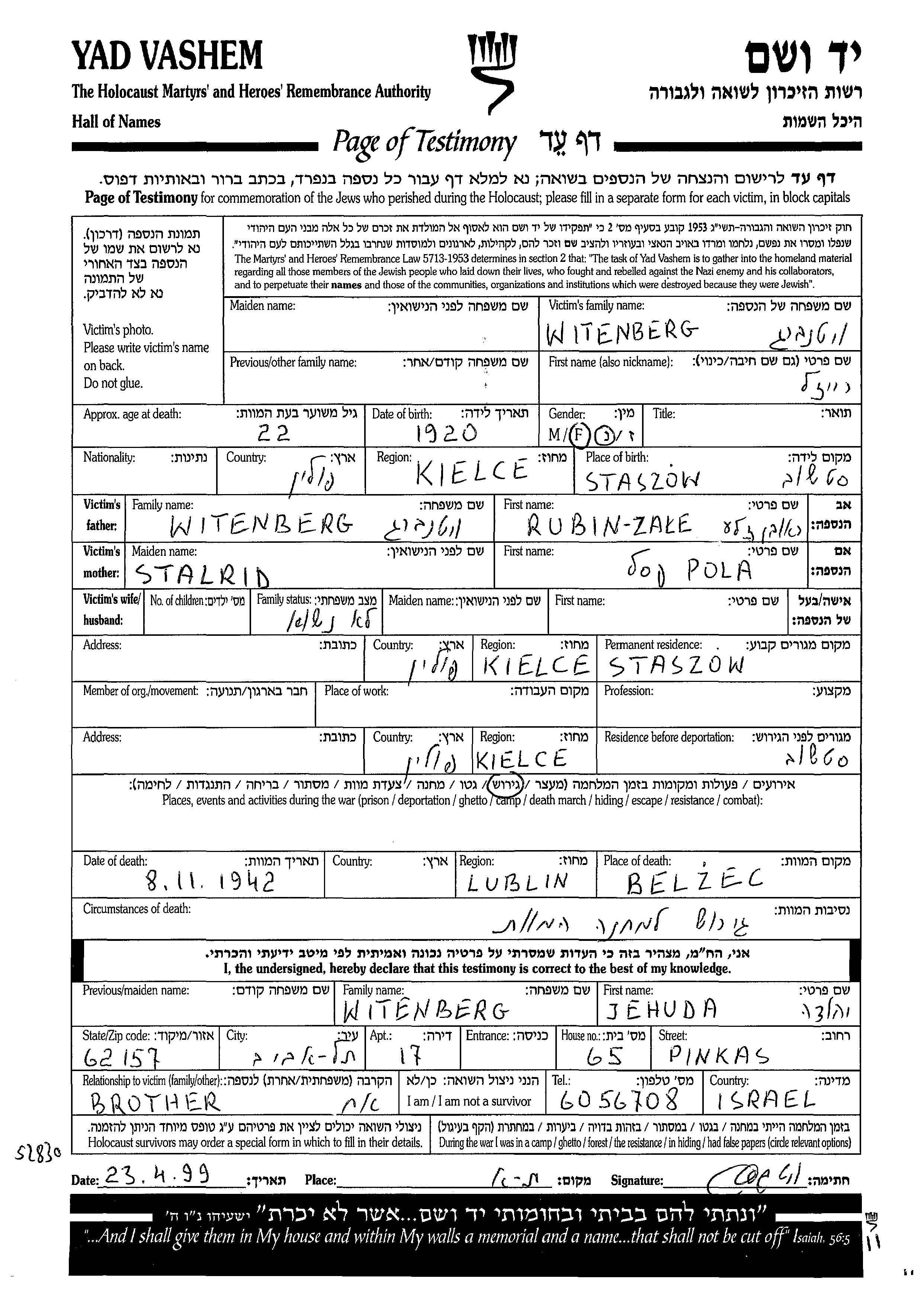 Witenberg Reizl 1920 Staszow, Pologne Feuille de témoignage