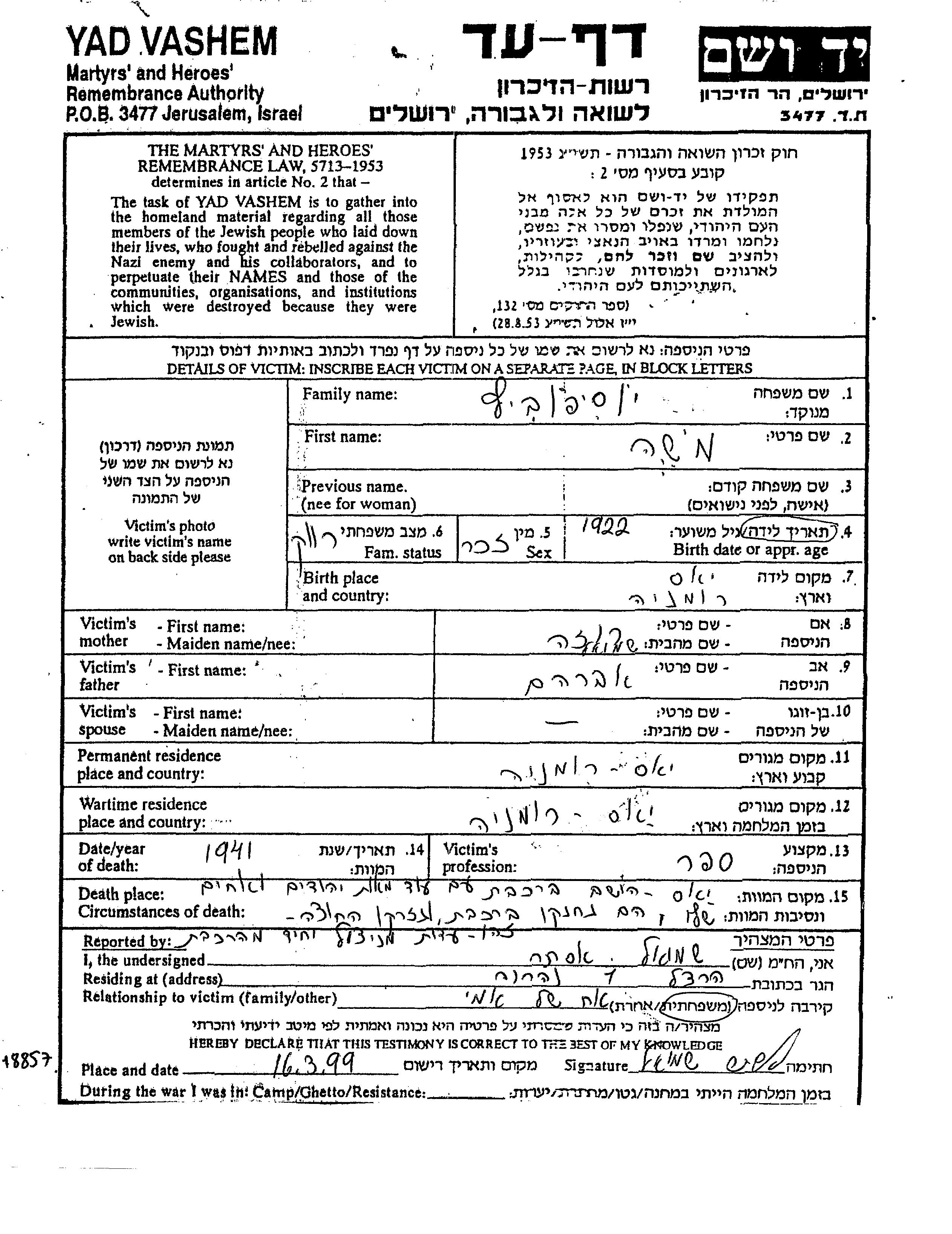 Yad Vashem - Pages of Testimony Names Memorial Collection