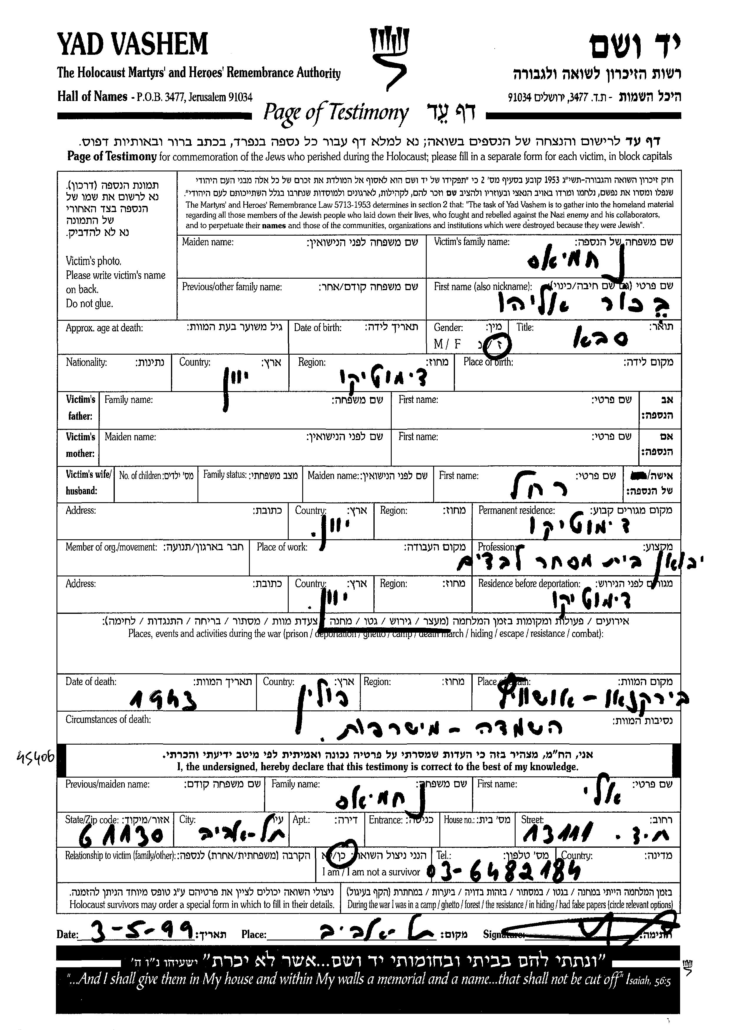 Yad Vashem - Pages of Testimony Names Memorial Collection