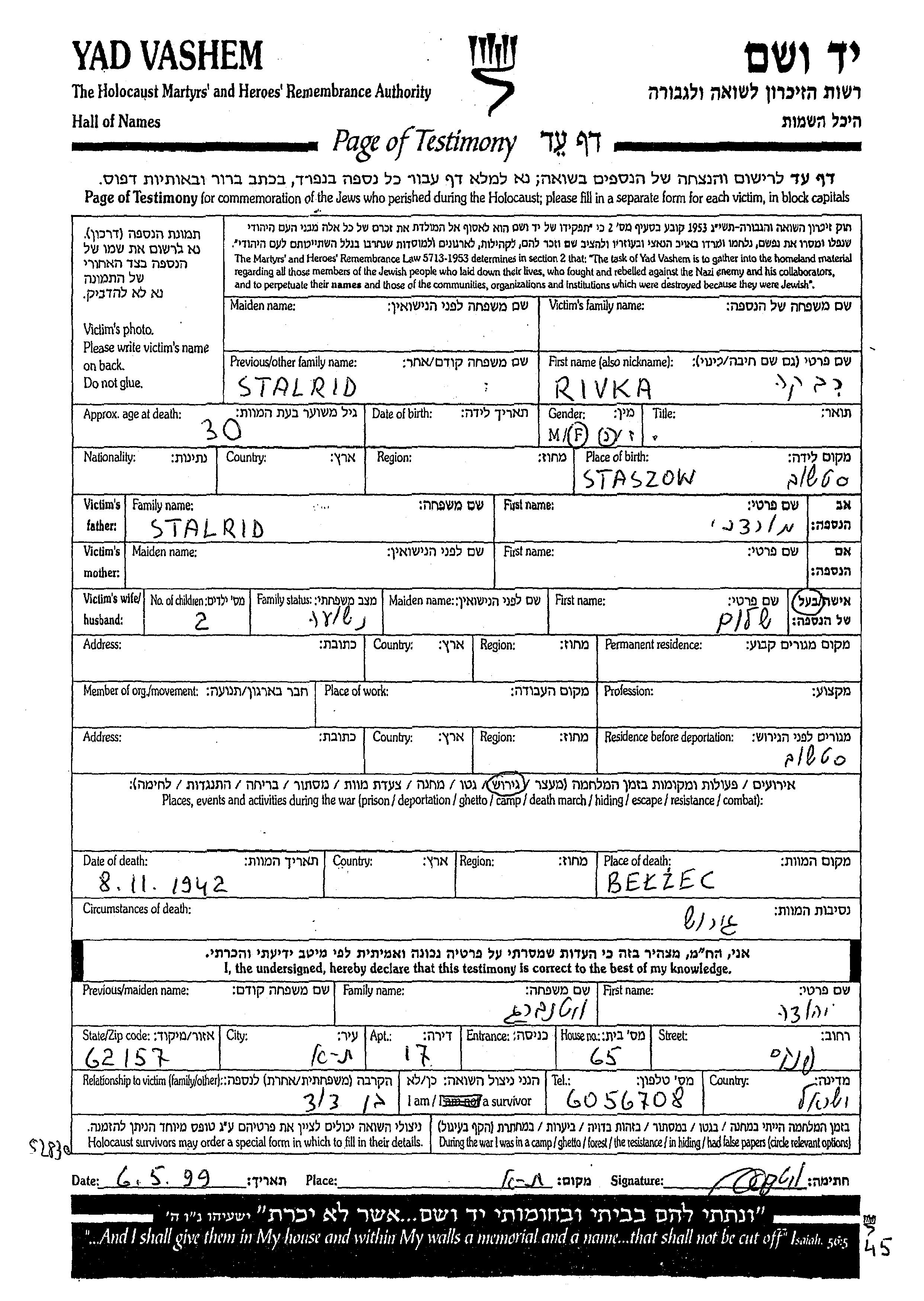 Stalrid Rivka endroit inconnu, Feuille de témoignage
