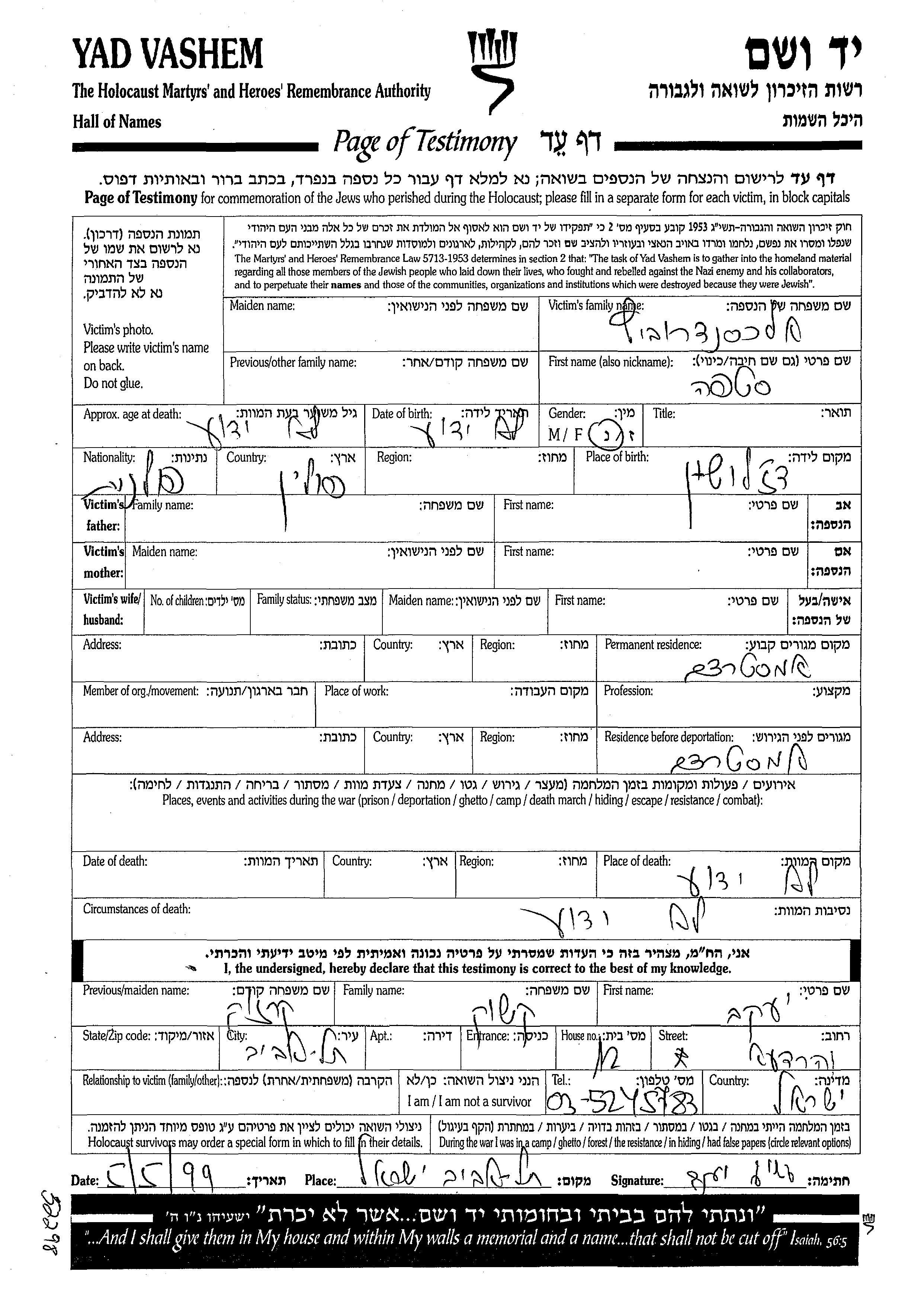Yad Vashem - Pages of Testimony Names Memorial Collection