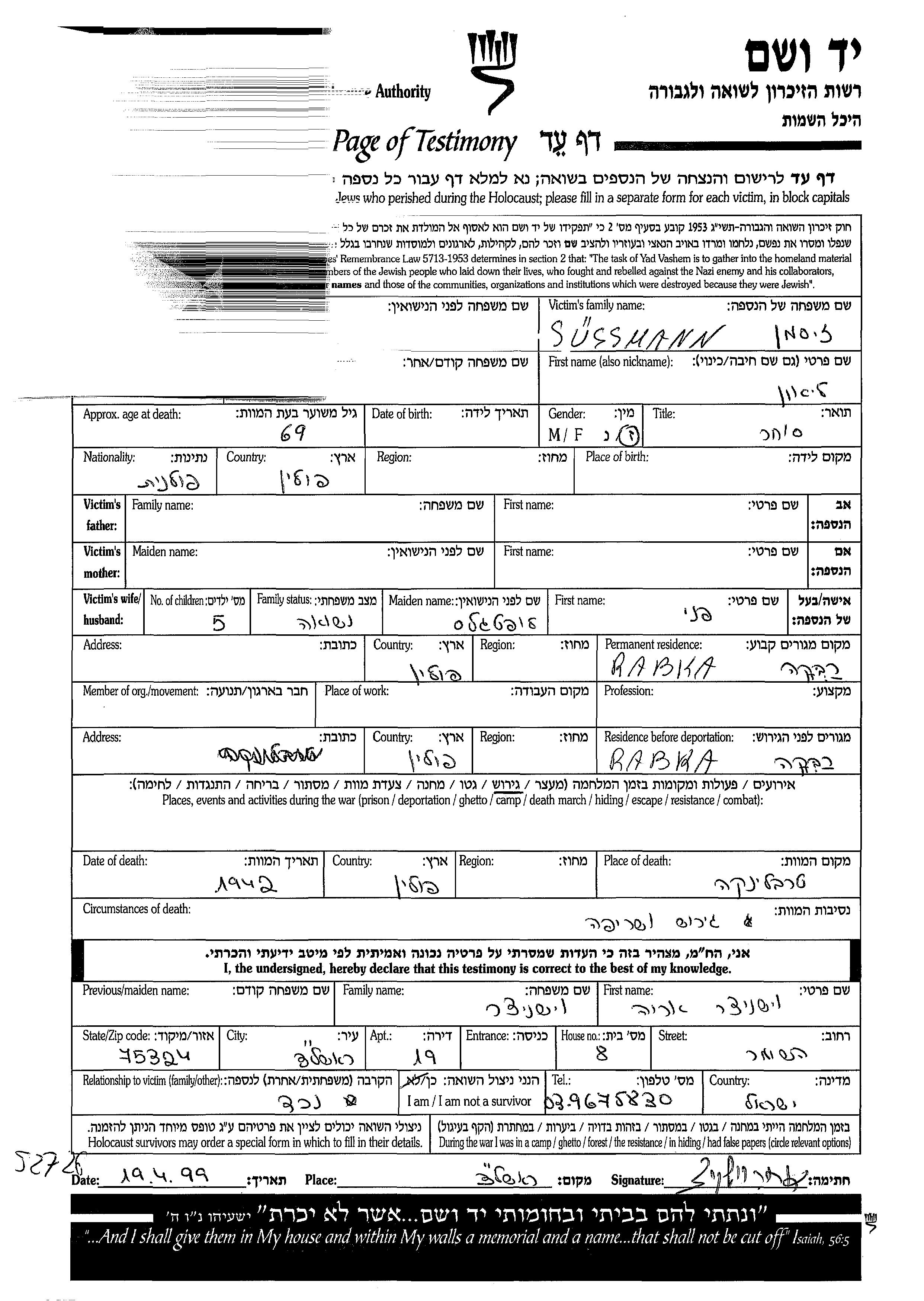 Sussmann Lion Rabka, Pologne Feuille de témoignage