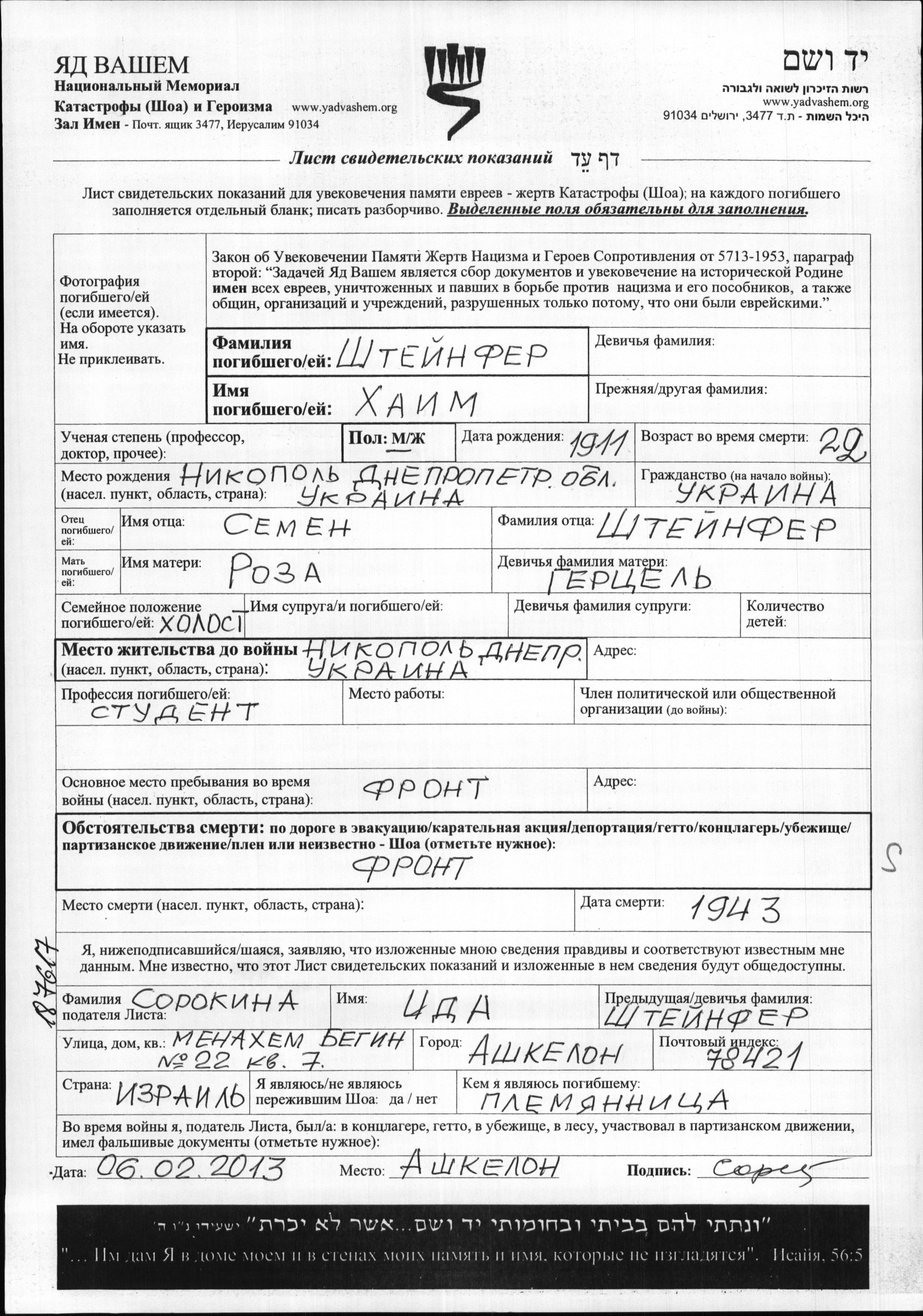 Shteynfer Khayim 1911 Nikopol, Ukraine (URSS) Feuille de témoignage