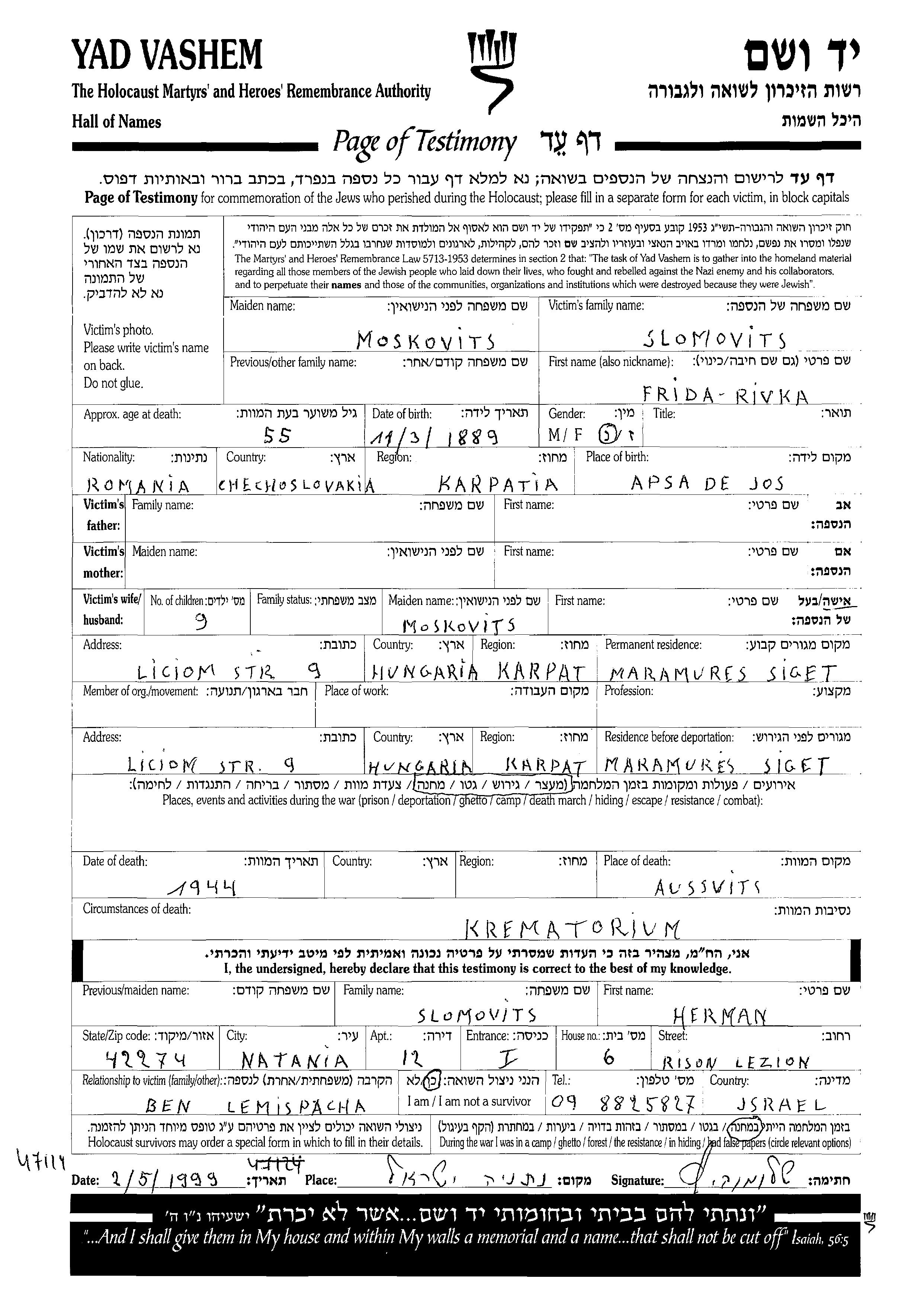Frida Rivka Slomovits née Moskovits est née à Apsa, Tchécoslovaquie en 1889. Elle était Mariée. Avant la seconde guerre mondiale elle vivait à Maramures, Roumanie. Pendant la guerre, elle était à Maramures, Roumanie.