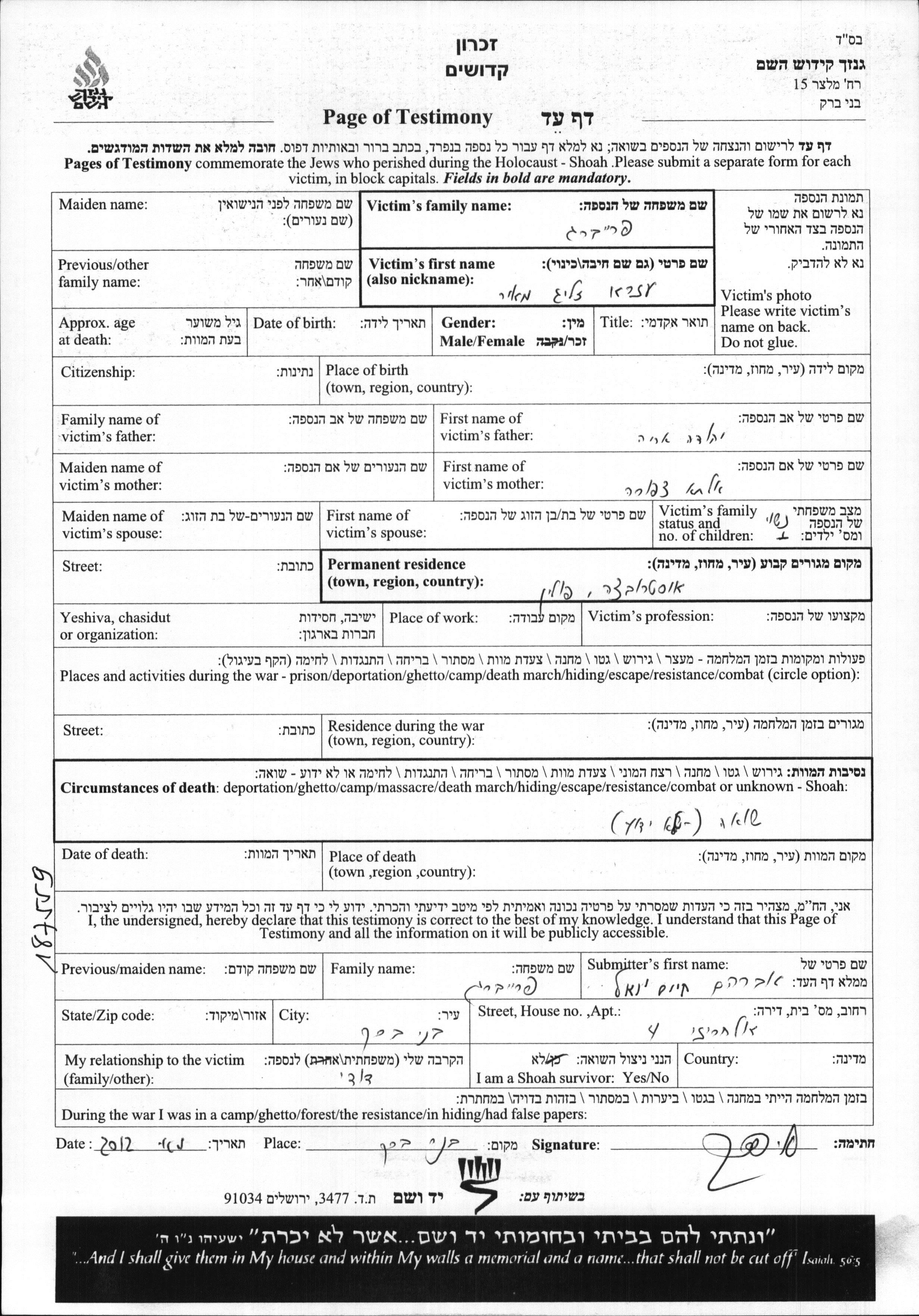 Yad Vashem - Pages of Testimony Names Memorial Collection
