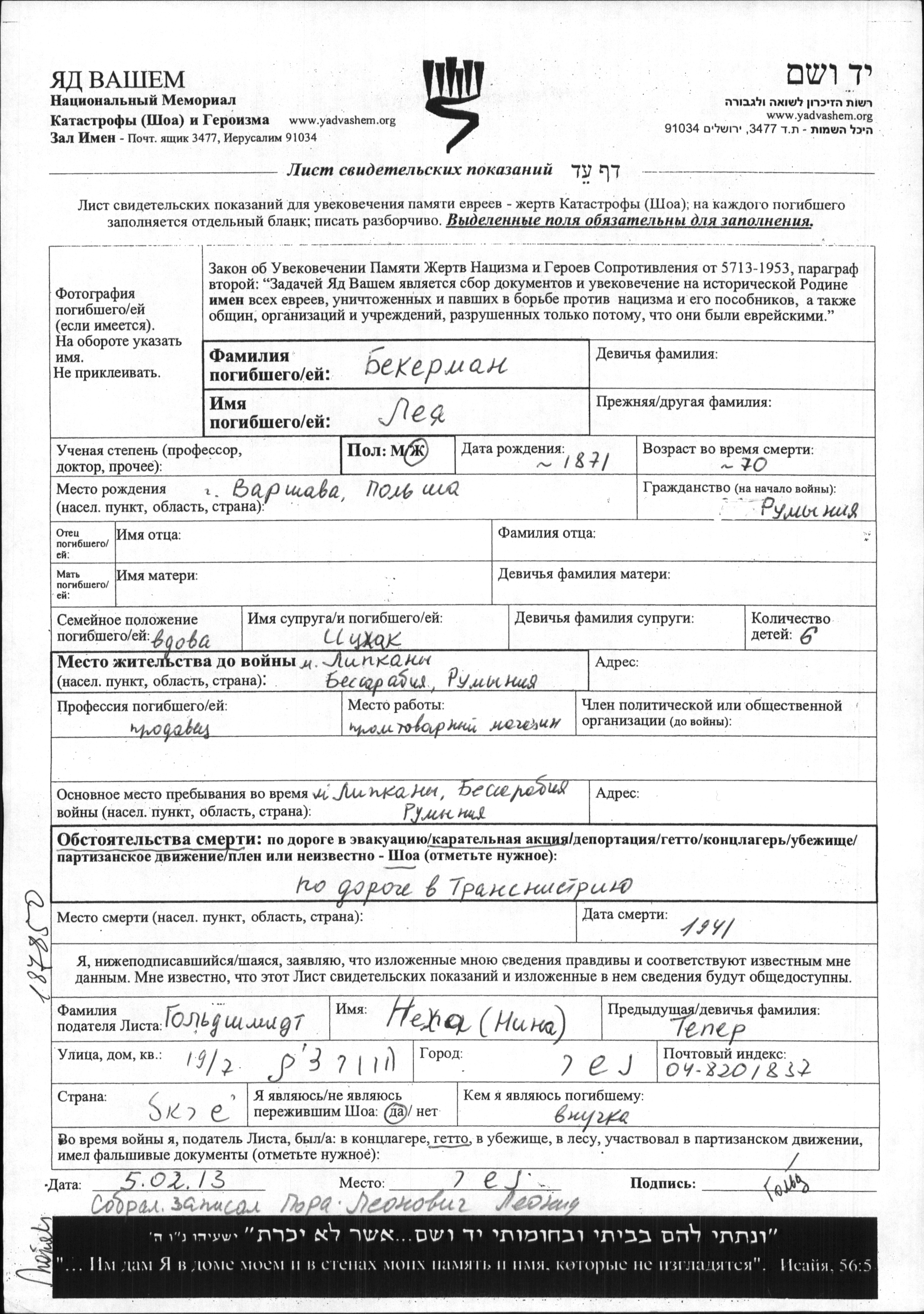 Leya Bekerman est née à Warszawa, Pologne en 1871. Elle était Vendeur/vendeuse magasin et veuve de Yitzkhak. Avant la seconde guerre mondiale elle vivait à Lipcani, Roumanie. Pendant la guerre, elle était à Lipcani, Roumanie.
