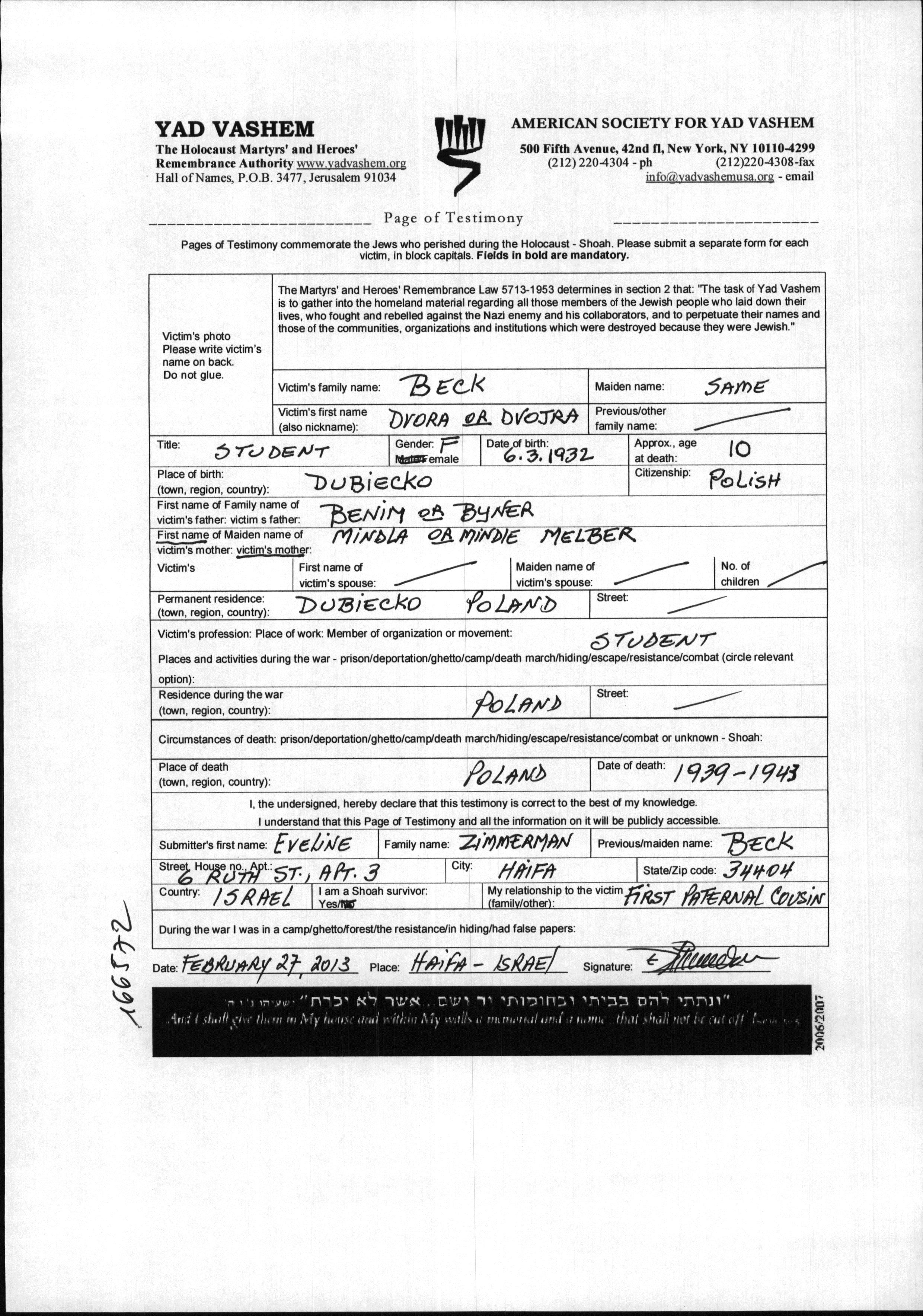 Beck Dvora 1932 Dubiecko, Pologne Feuille de témoignage
