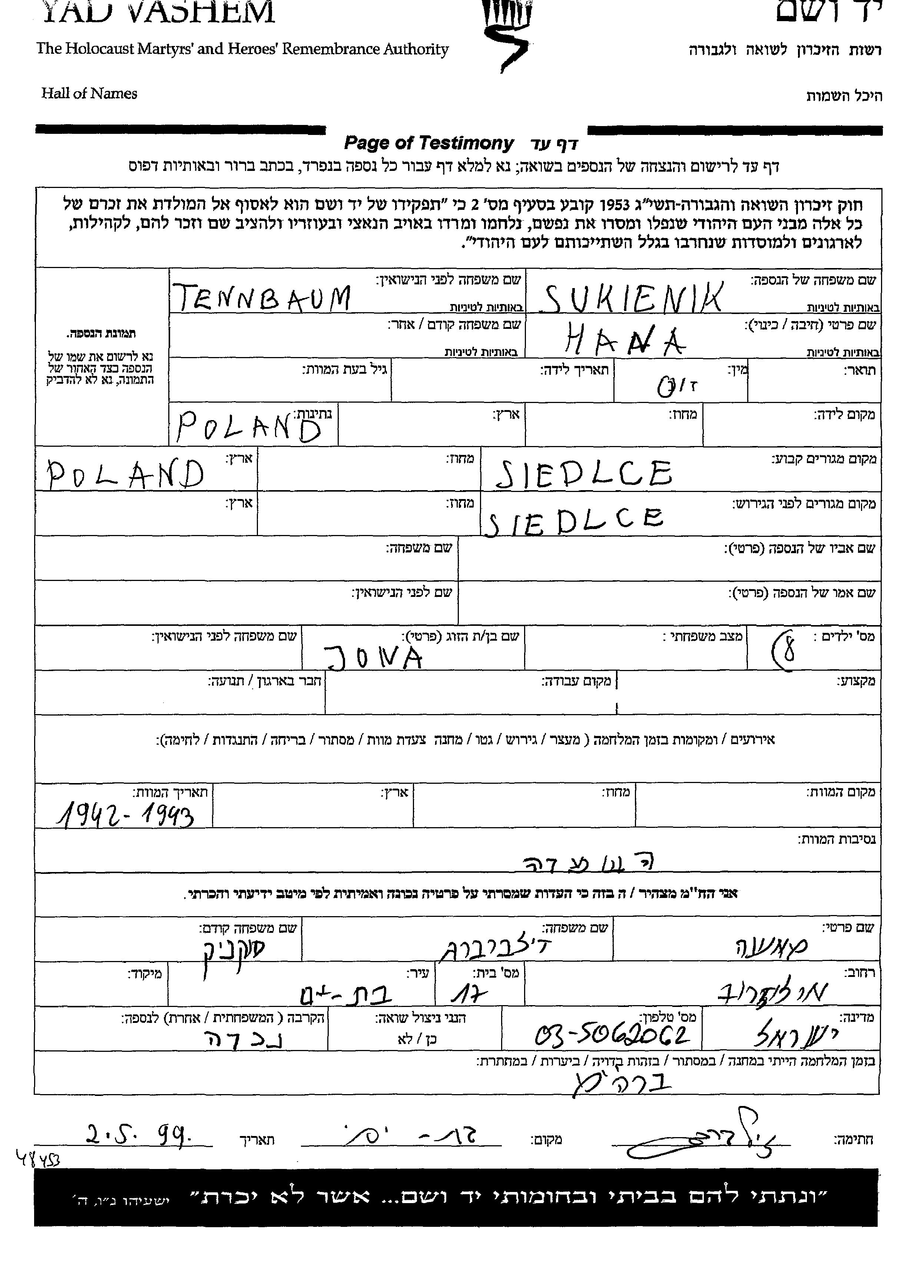 Sukienik Hana Siedlce, Pologne Feuille de témoignage