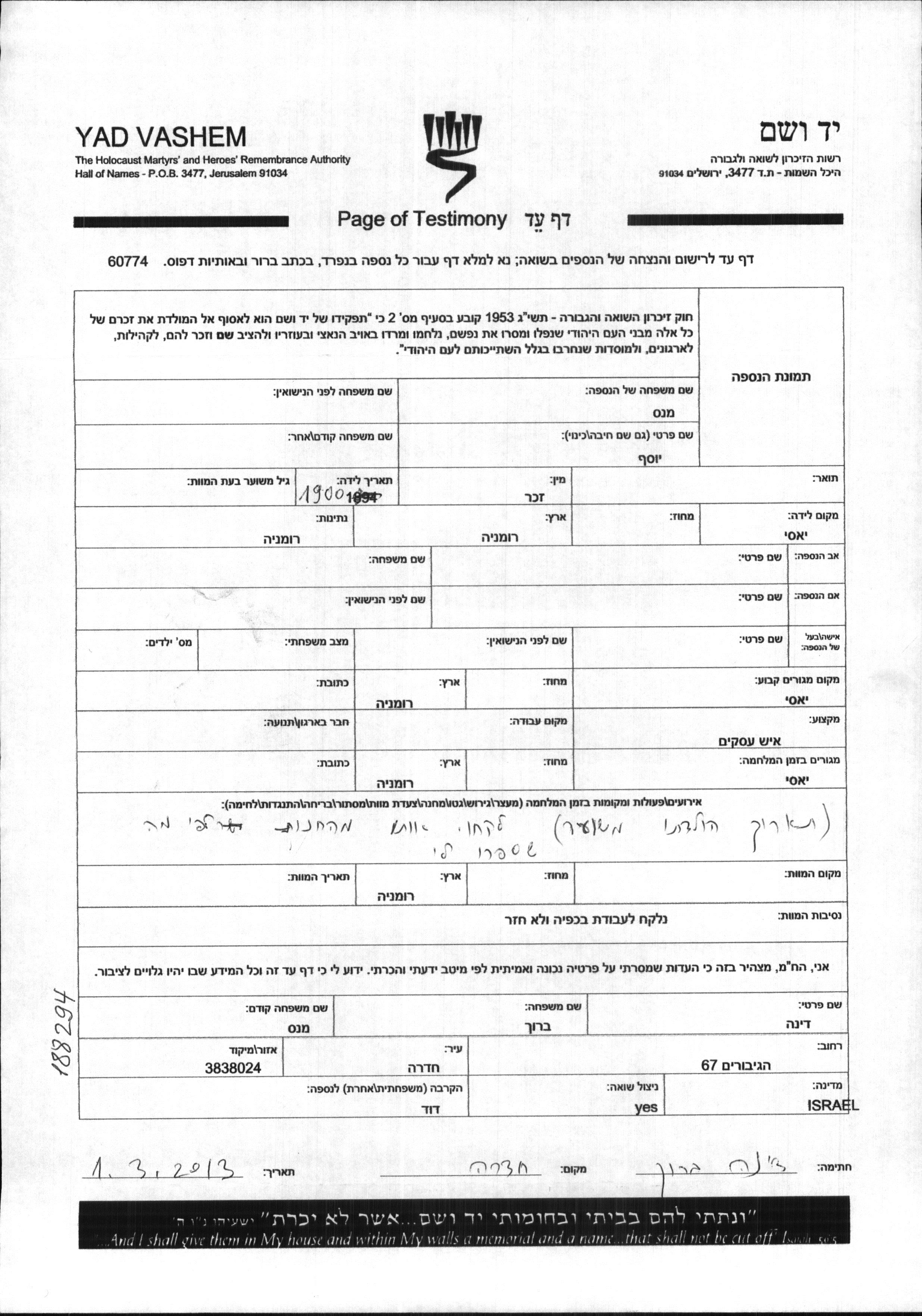 Yosef a été assassiné pendant la Shoah. Lieu de la mort: Roumanie.