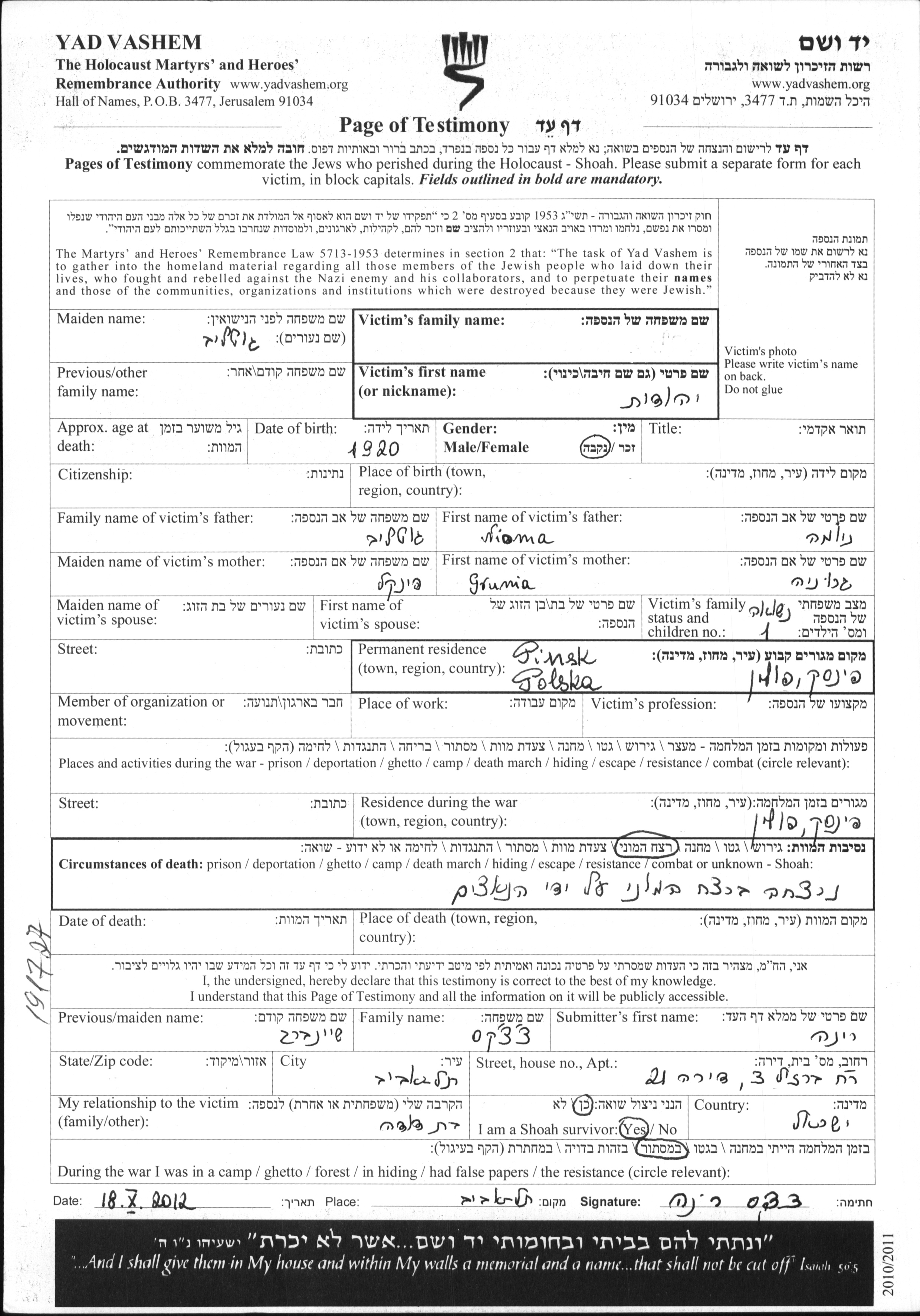 Yad Vashem - Pages of Testimony Names Memorial Collection