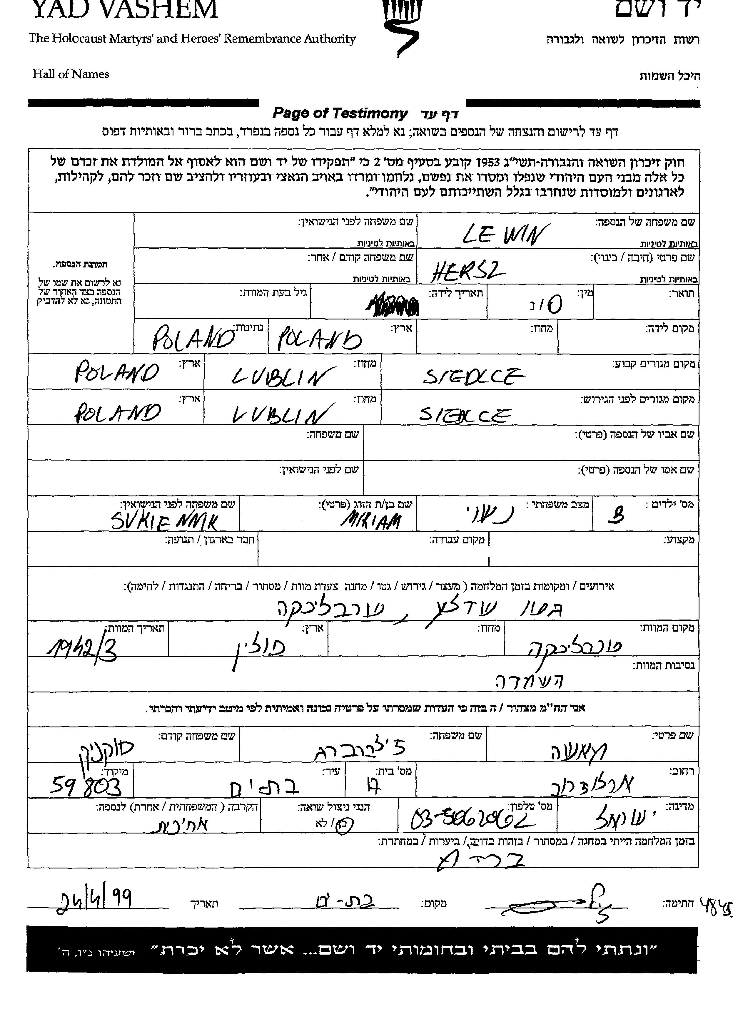 Lewin Hersz Siedlce, Pologne Feuille de témoignage