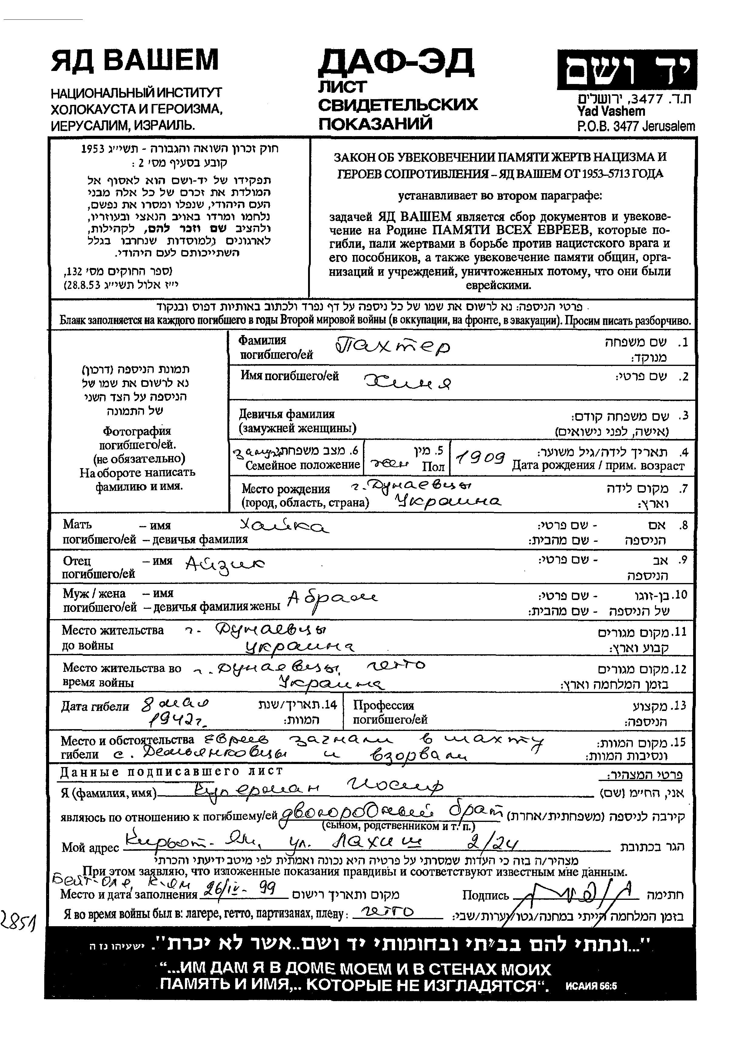 Pakhter Khinya 1909 Dunajevcy, Ukraine (URSS) Feuille de témoignage