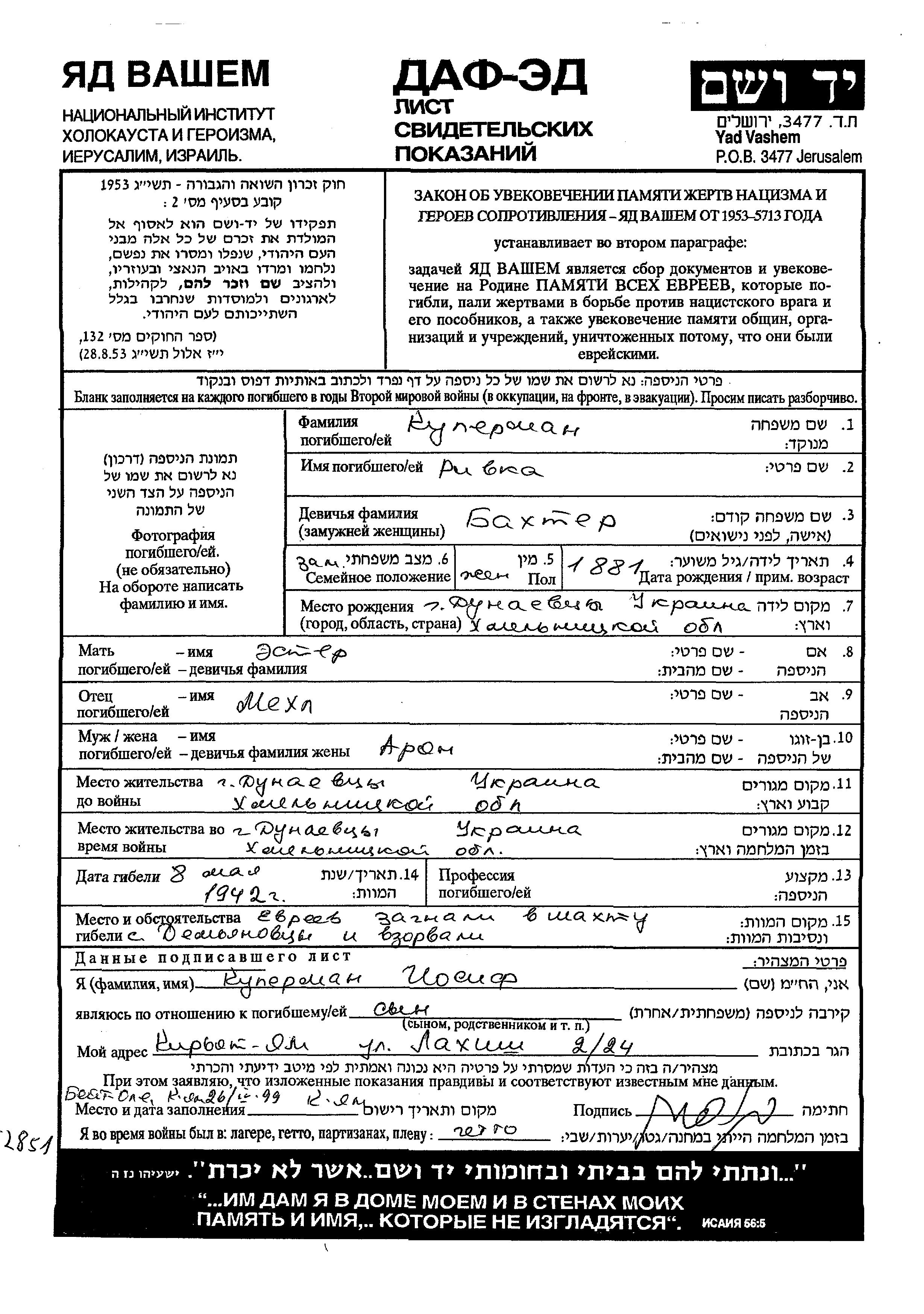Kuperman Rivka 1881 Dunayevtsy, Ukraine (URSS) Feuille de témoignage