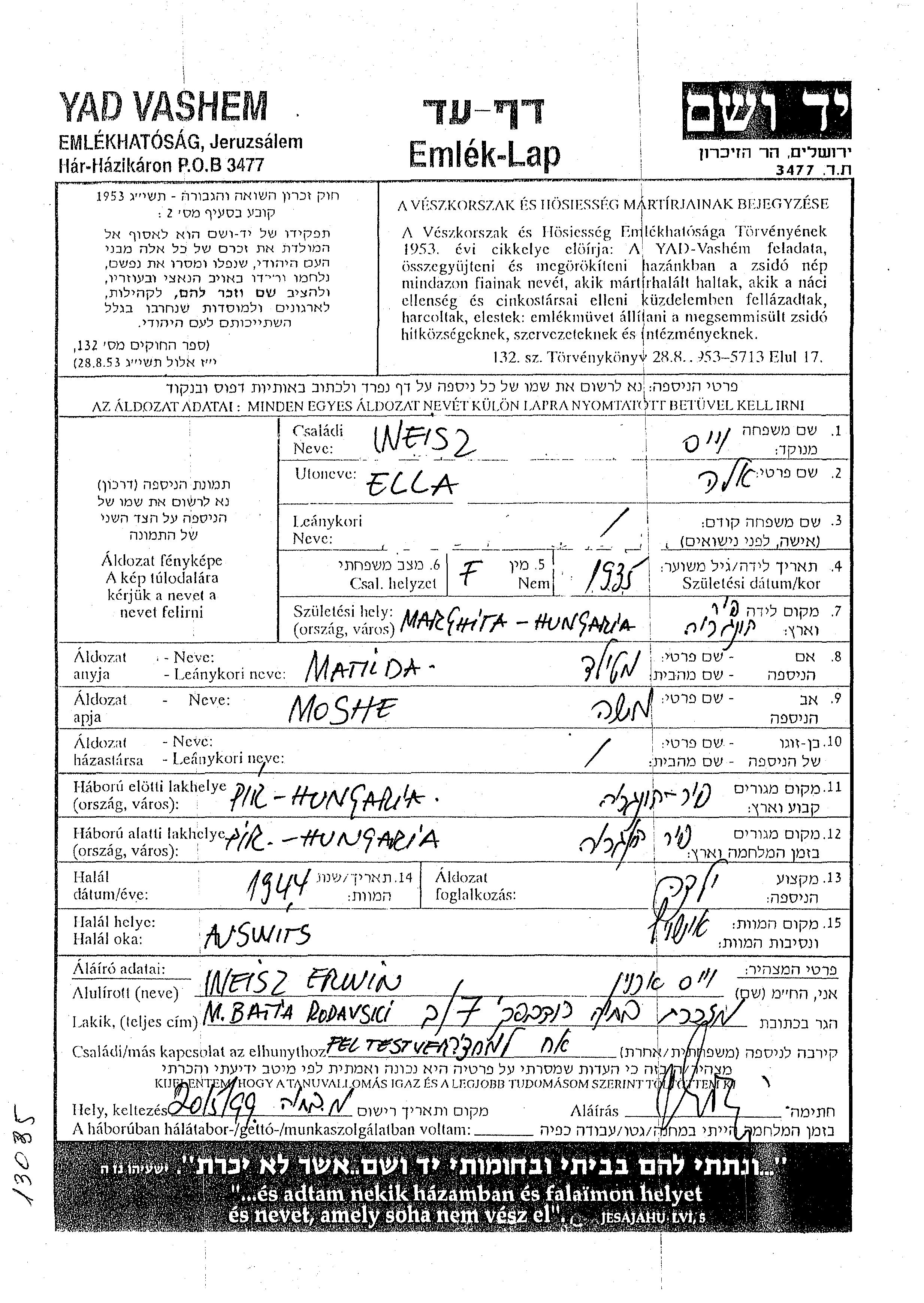 Weisz Ella 1935 Pir, Roumanie Feuille de témoignage
