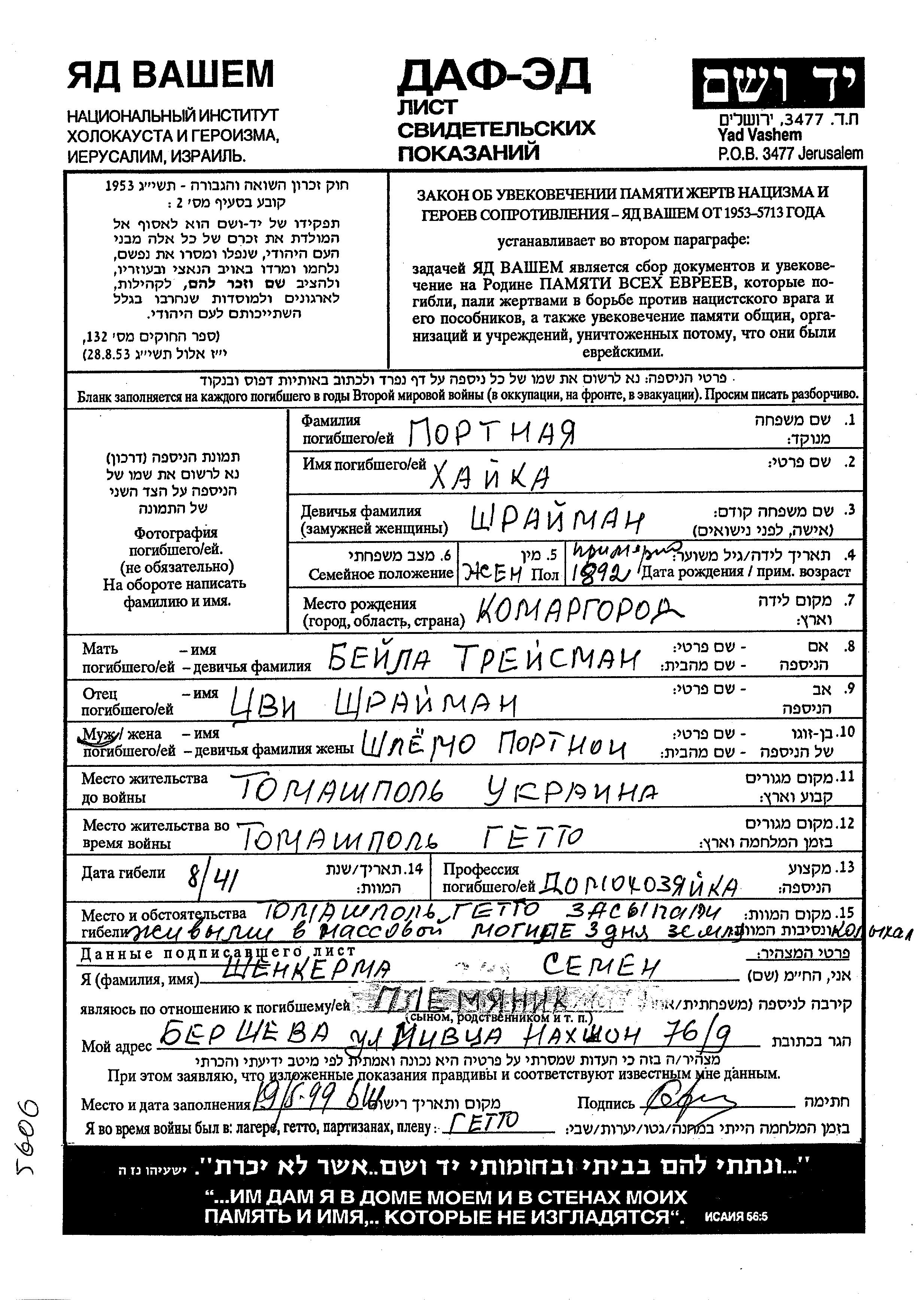 Portnaya Khayka 1892 Tomashpol, Ukraine (URSS) Feuille de témoignage