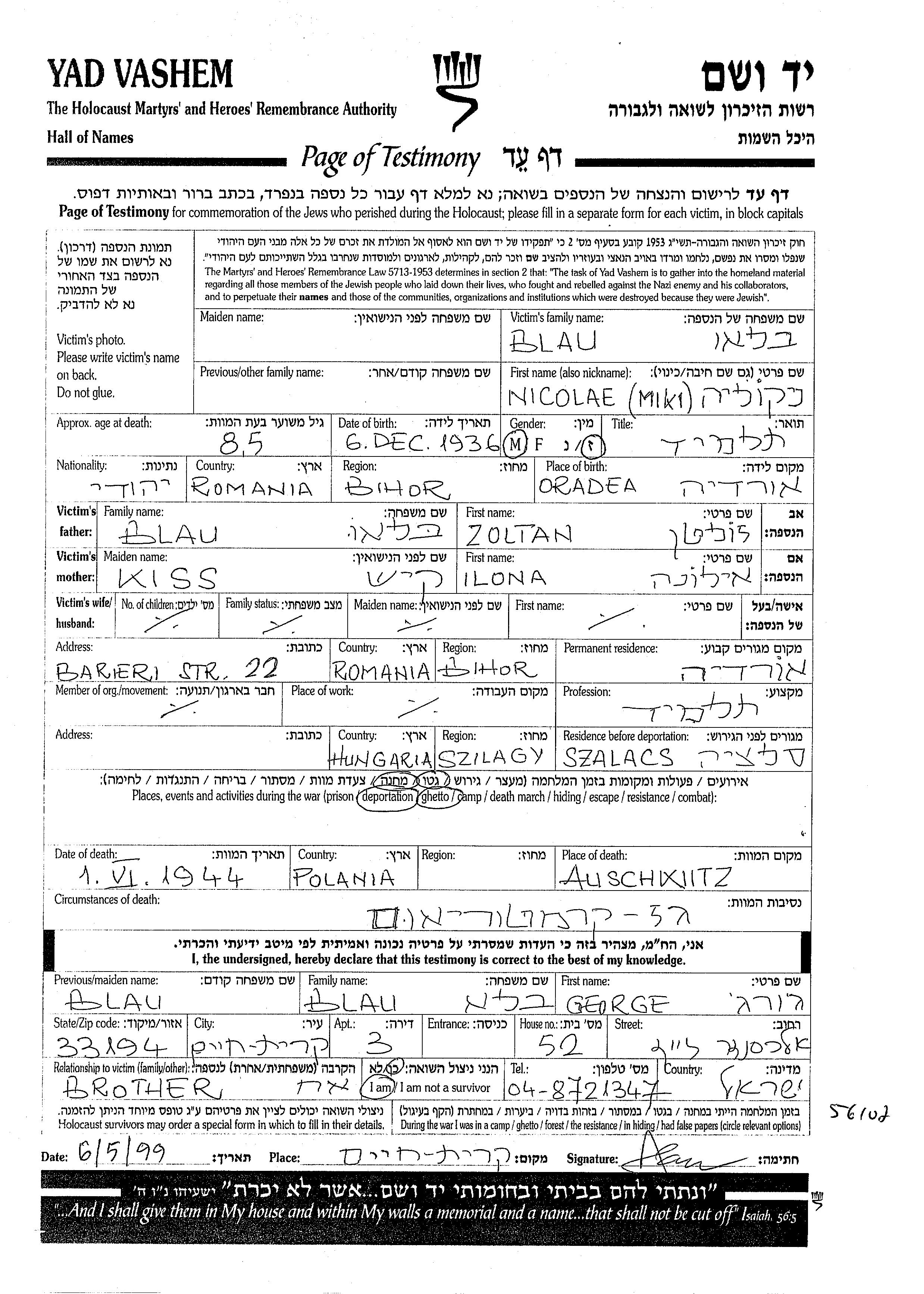 Nicolae Miki Blau est né à Oradea, Roumanie en 1936, fils de Zoltan et de Ilona. Il était Élève. Avant la seconde guerre mondiale il vivait à Oradea, Roumanie. Au cours de la guerre, il était à Szalacs, Roumanie.