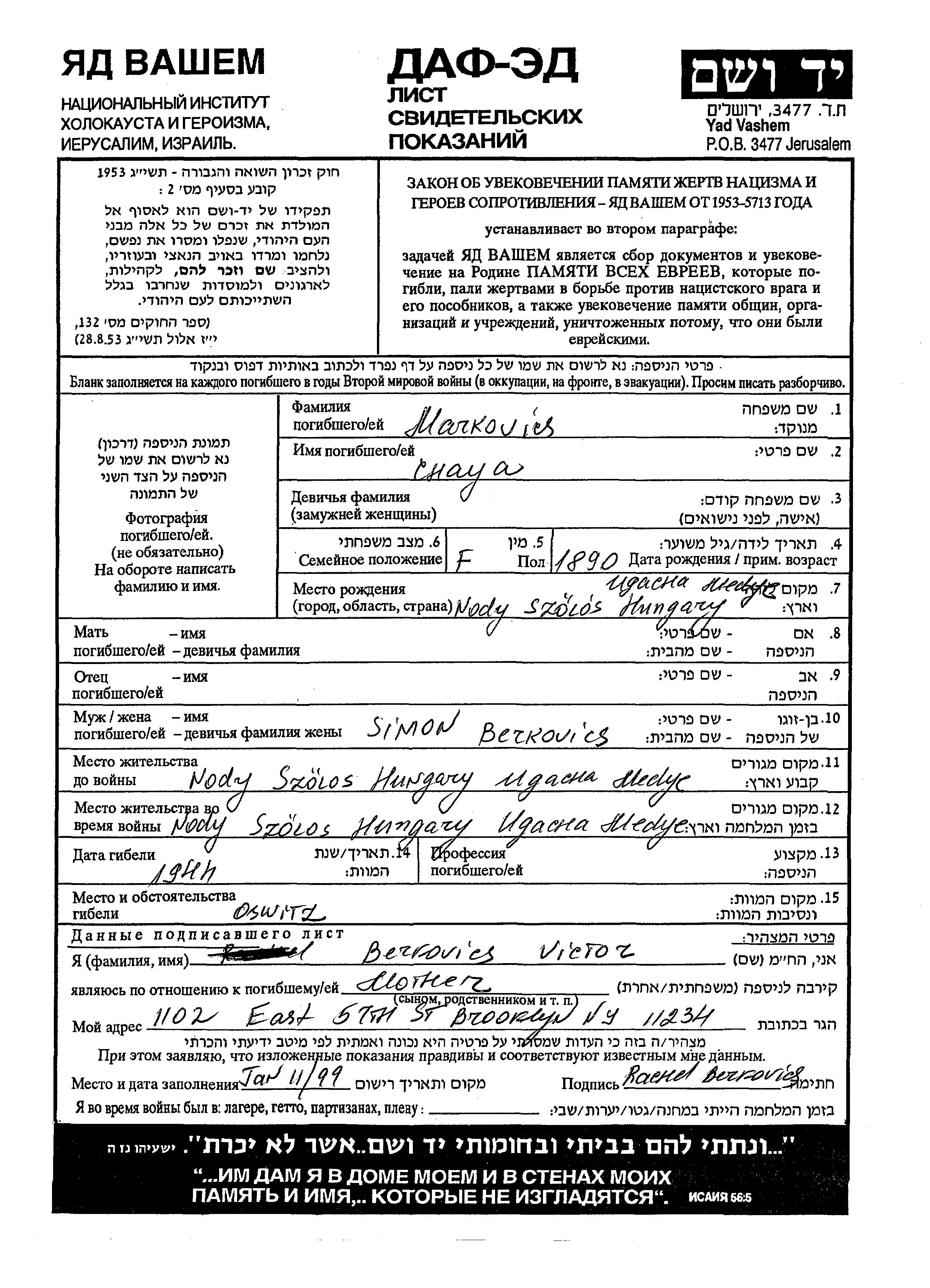 Berkovics Chaya 1890 Nagy Szollos, Tchécoslovaquie Feuille de témoignage