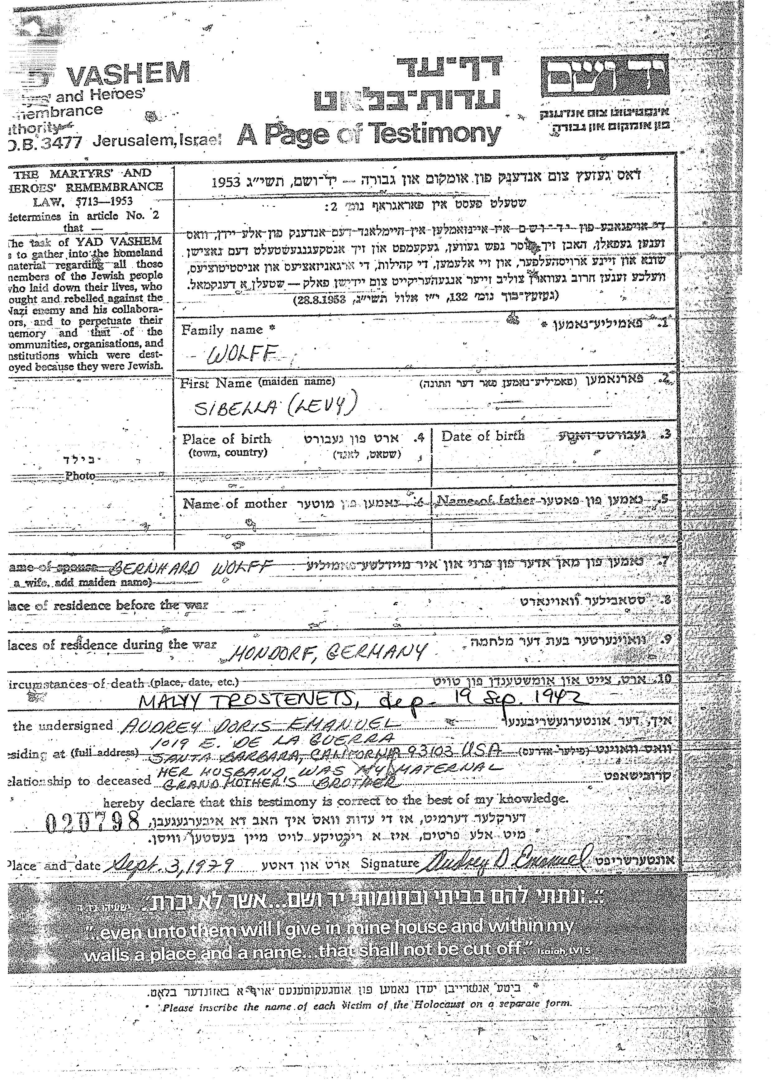 Wolff Sibella endroit inconnu, Feuille de témoignage