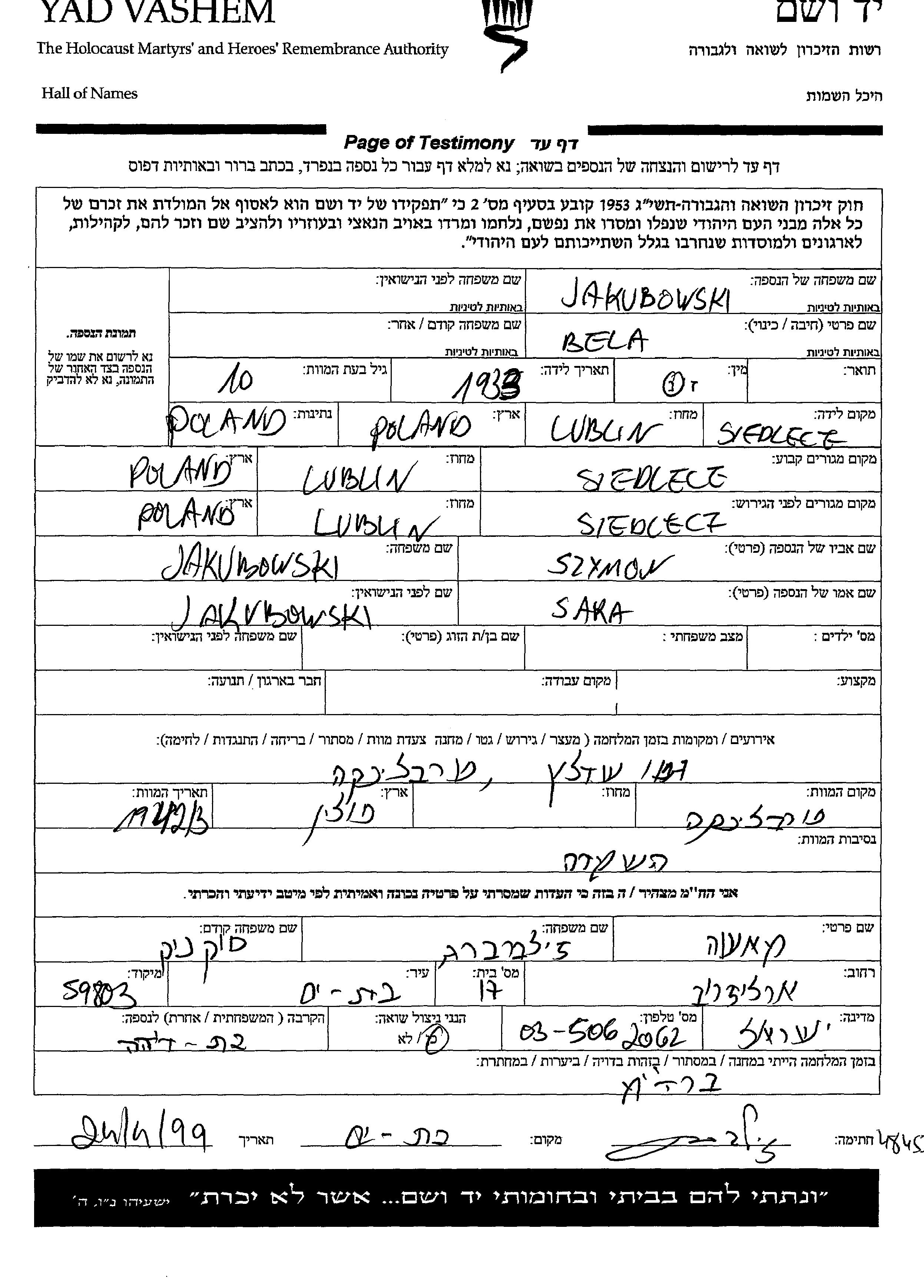 Jakubowski Bela 1933 Siedlce, Pologne Feuille de témoignage