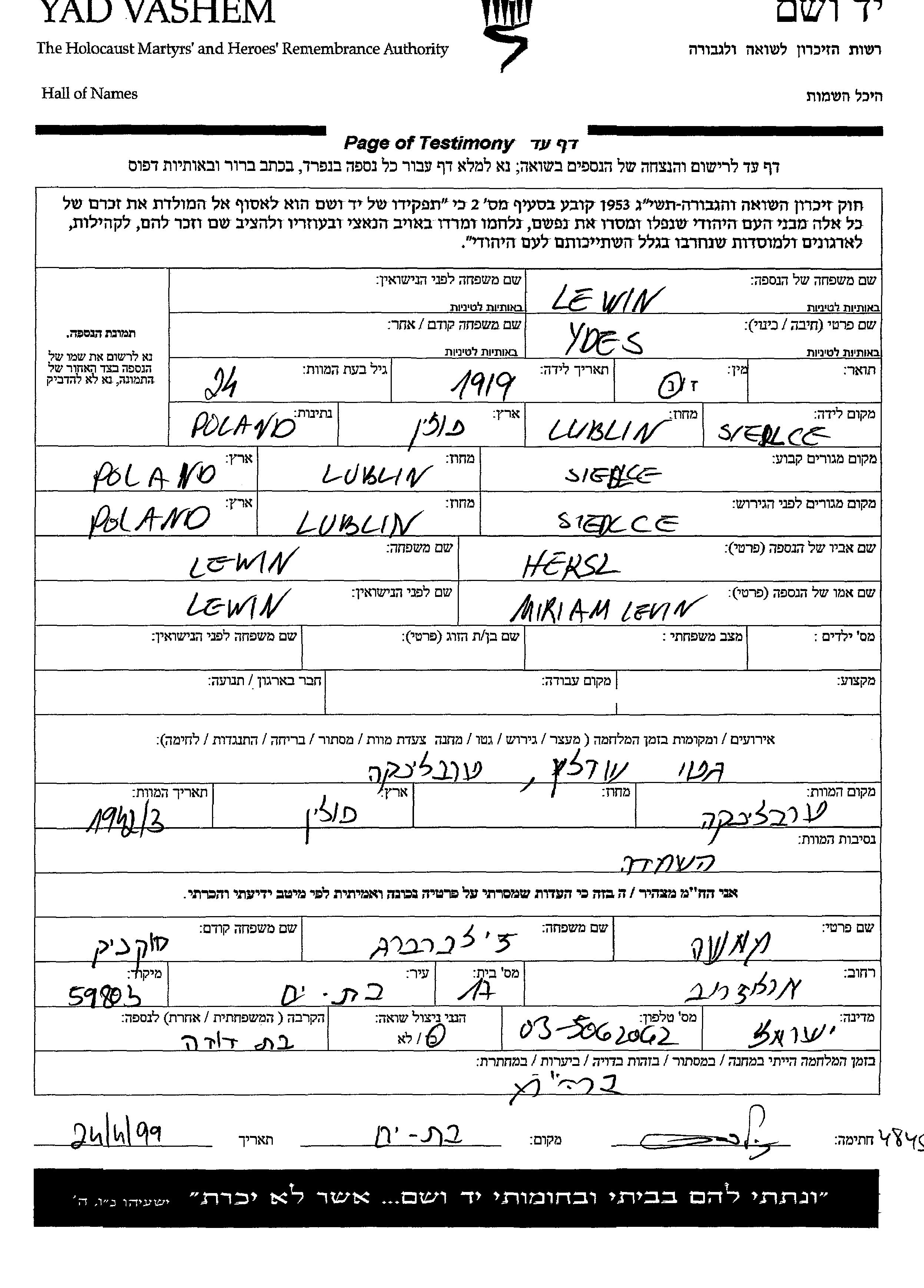 Lewin Ydes 1919 Siedlce, Pologne Feuille de témoignage