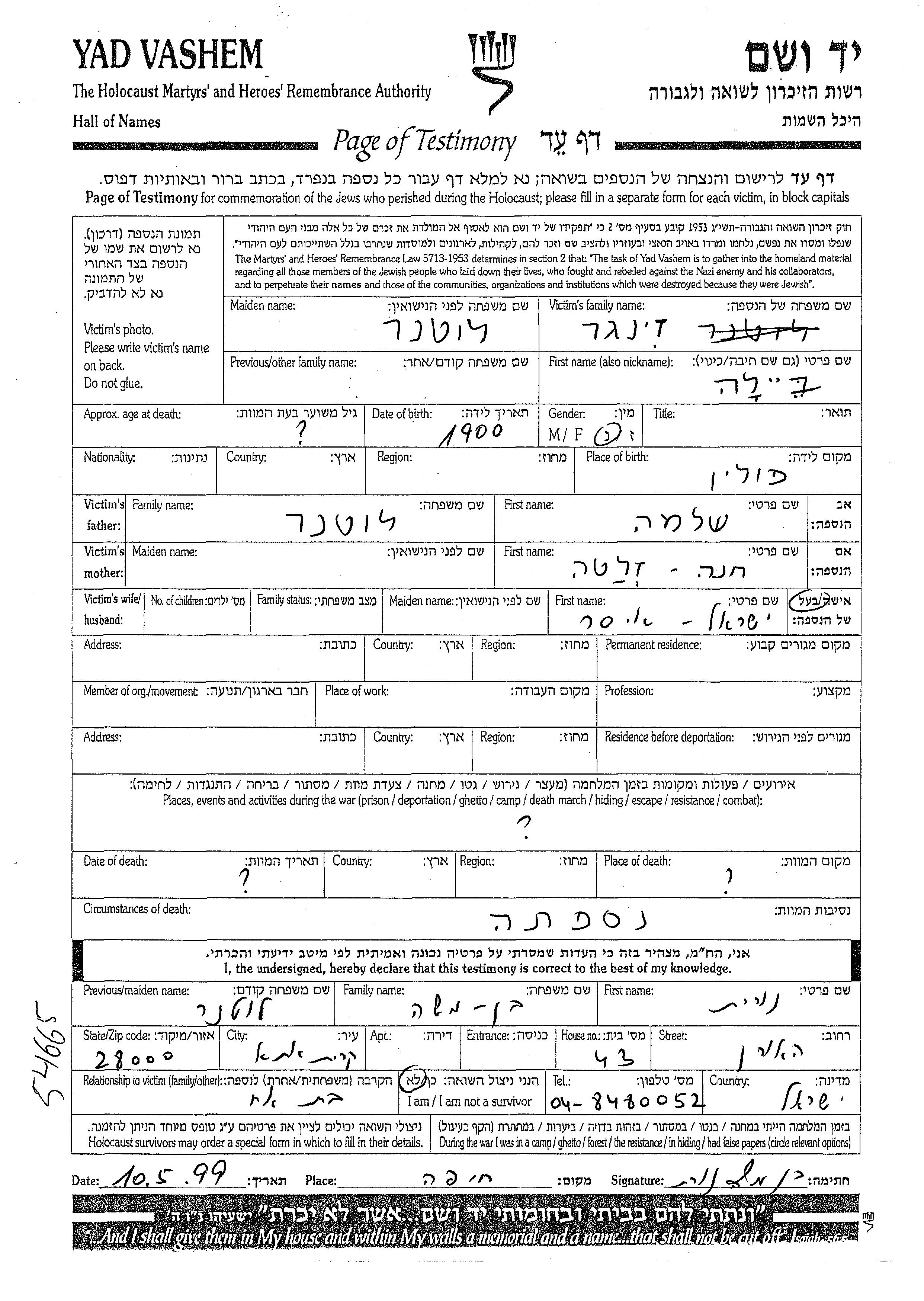 Yad Vashem - Pages of Testimony Names Memorial Collection