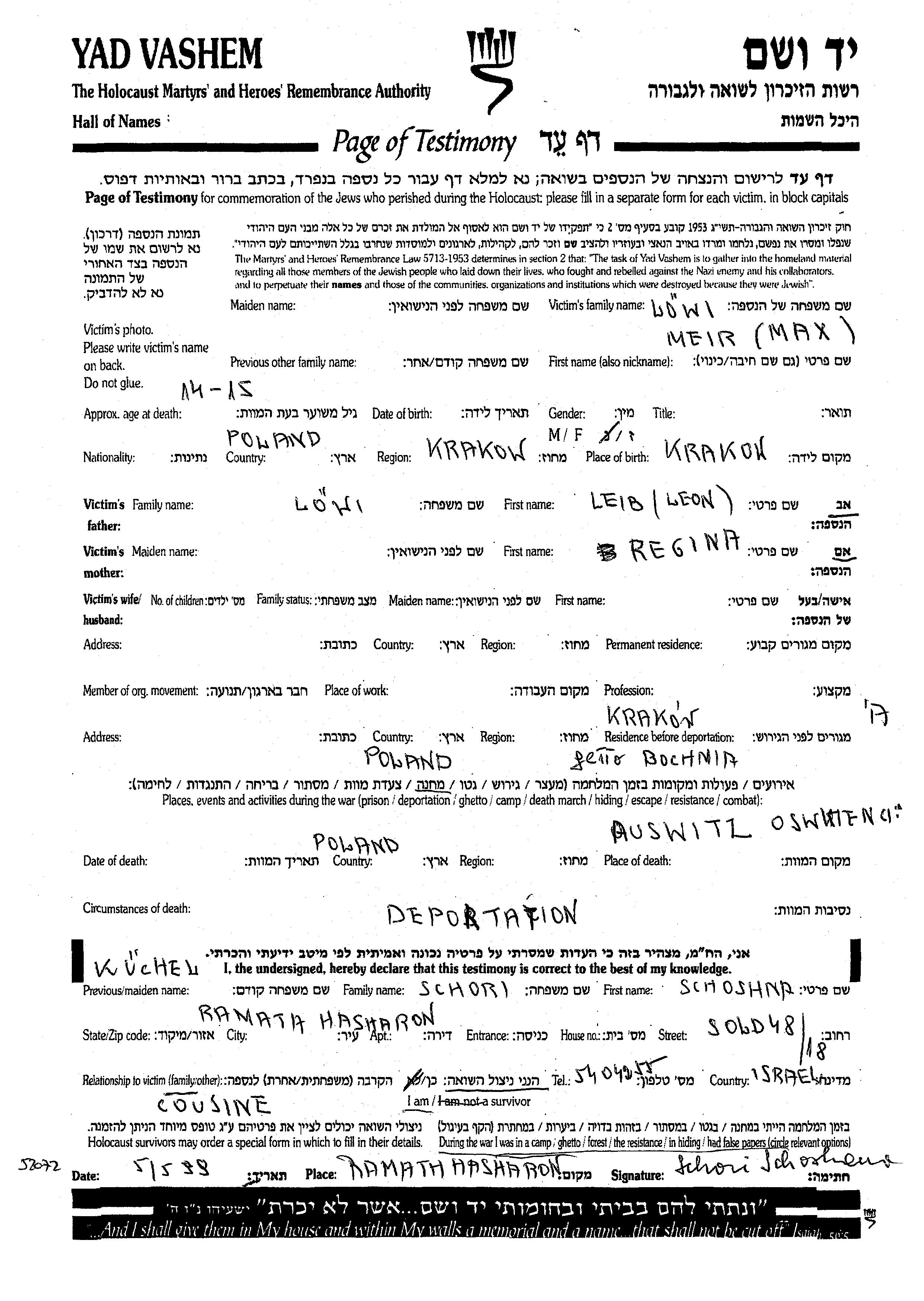 Lowi Meir Max Krakow, Pologne Feuille de témoignage