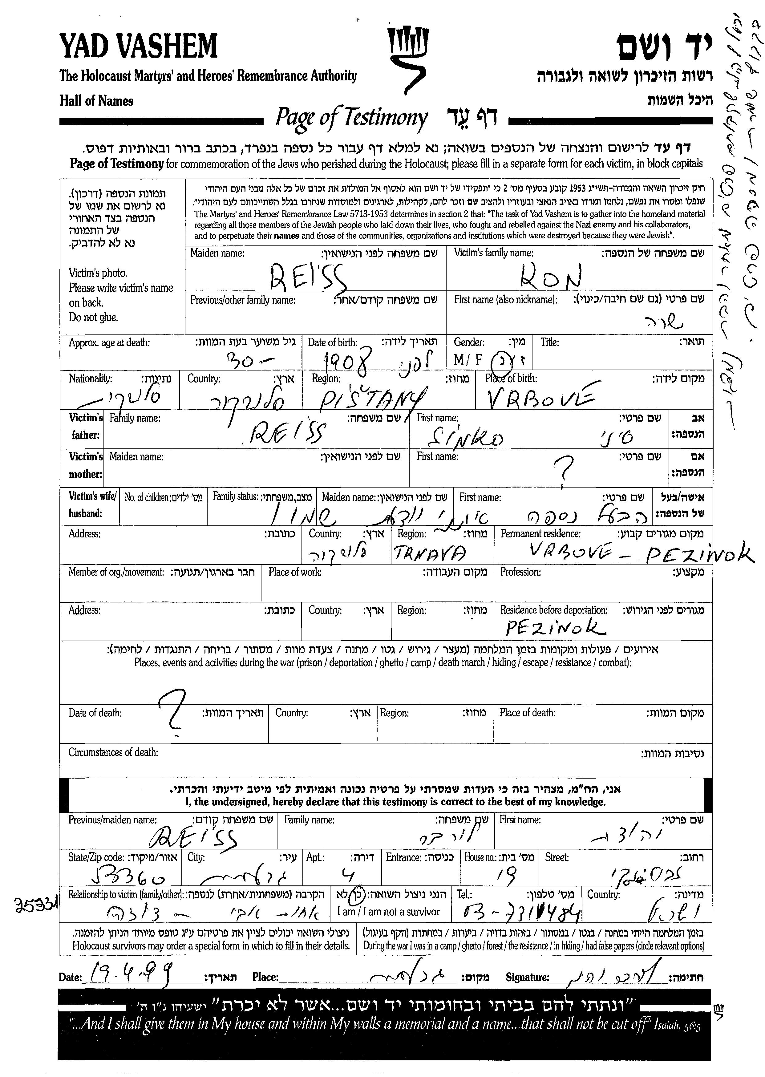 Yad Vashem - Pages of Testimony Names Memorial Collection