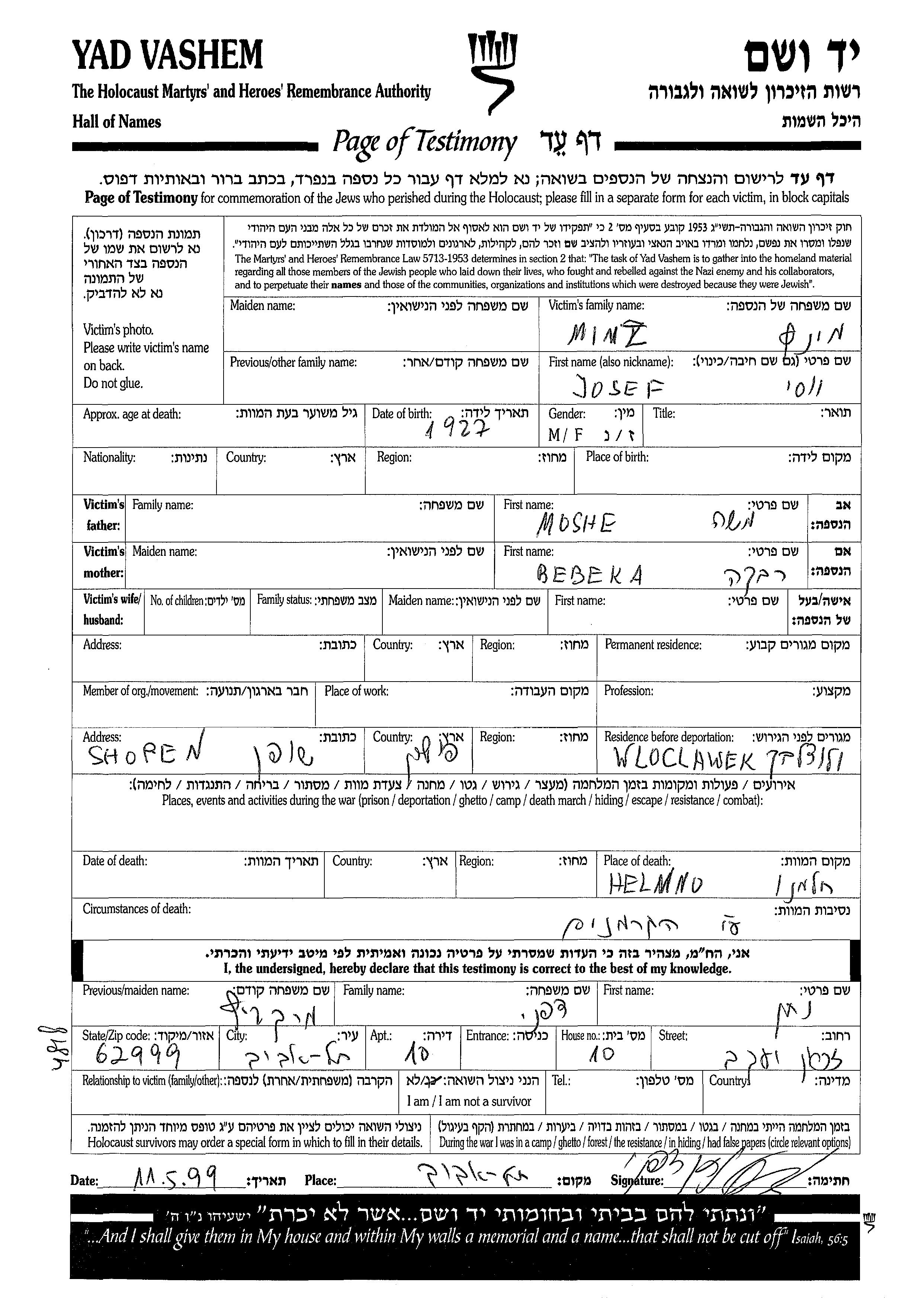 Minz Josef 1927 endroit inconnu, Feuille de témoignage