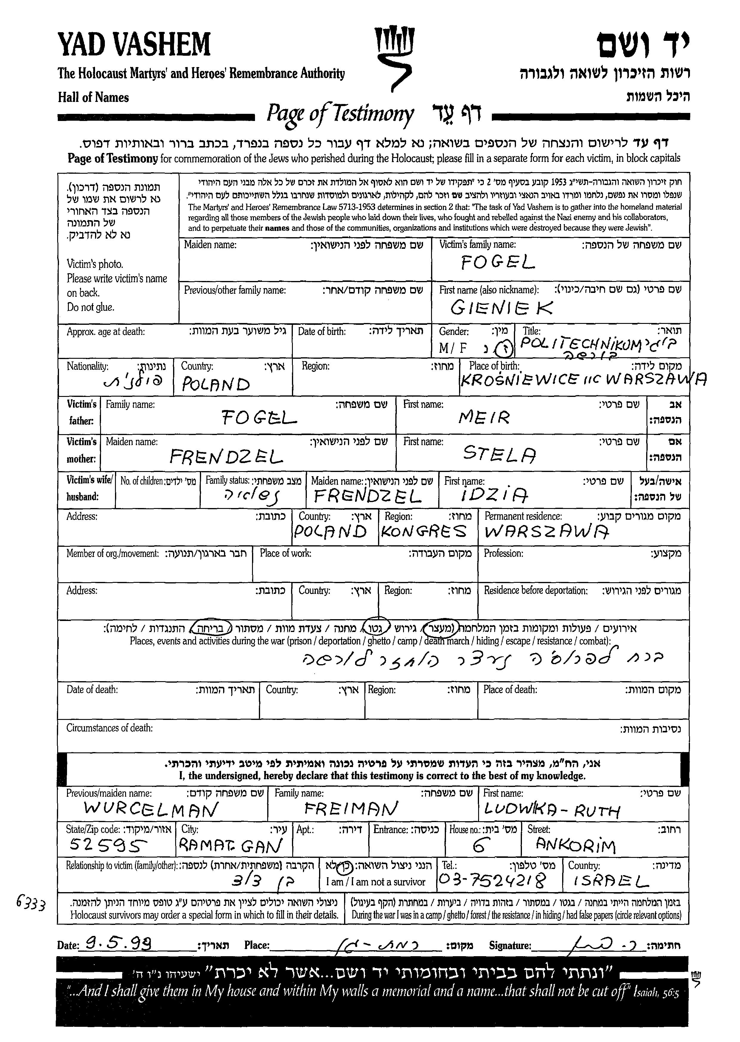 Fogel Gieniek Warszawa, Pologne Feuille de témoignage