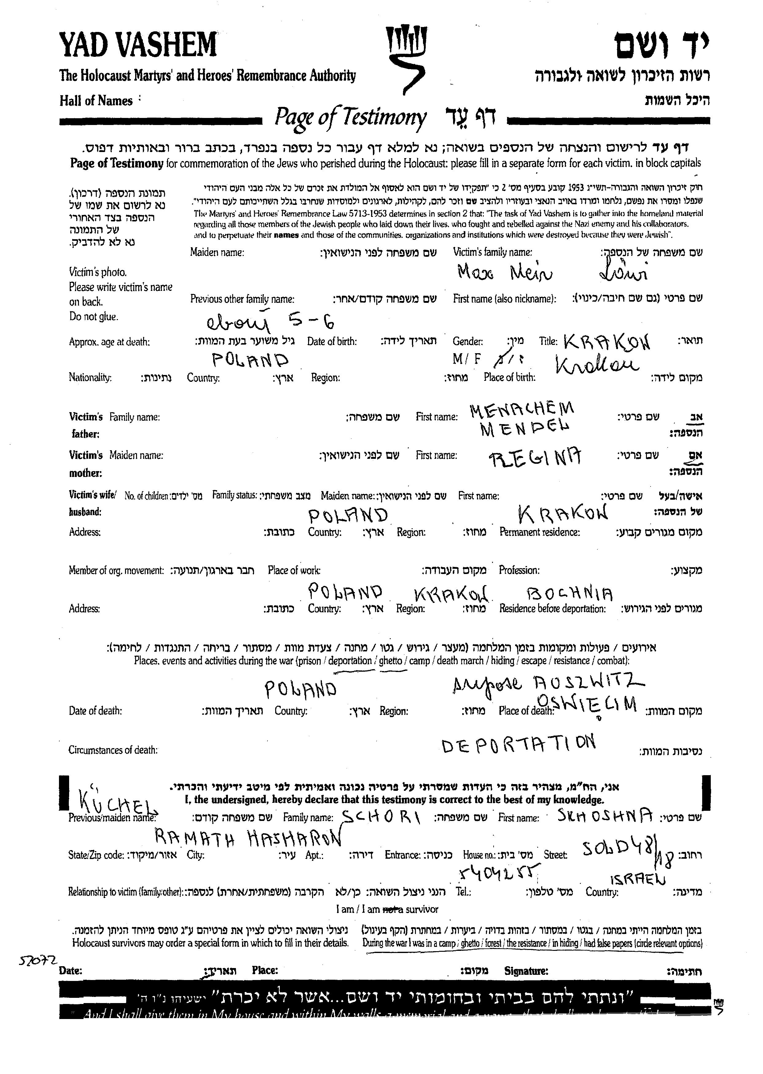 Yad Vashem - Pages of Testimony Names Memorial Collection