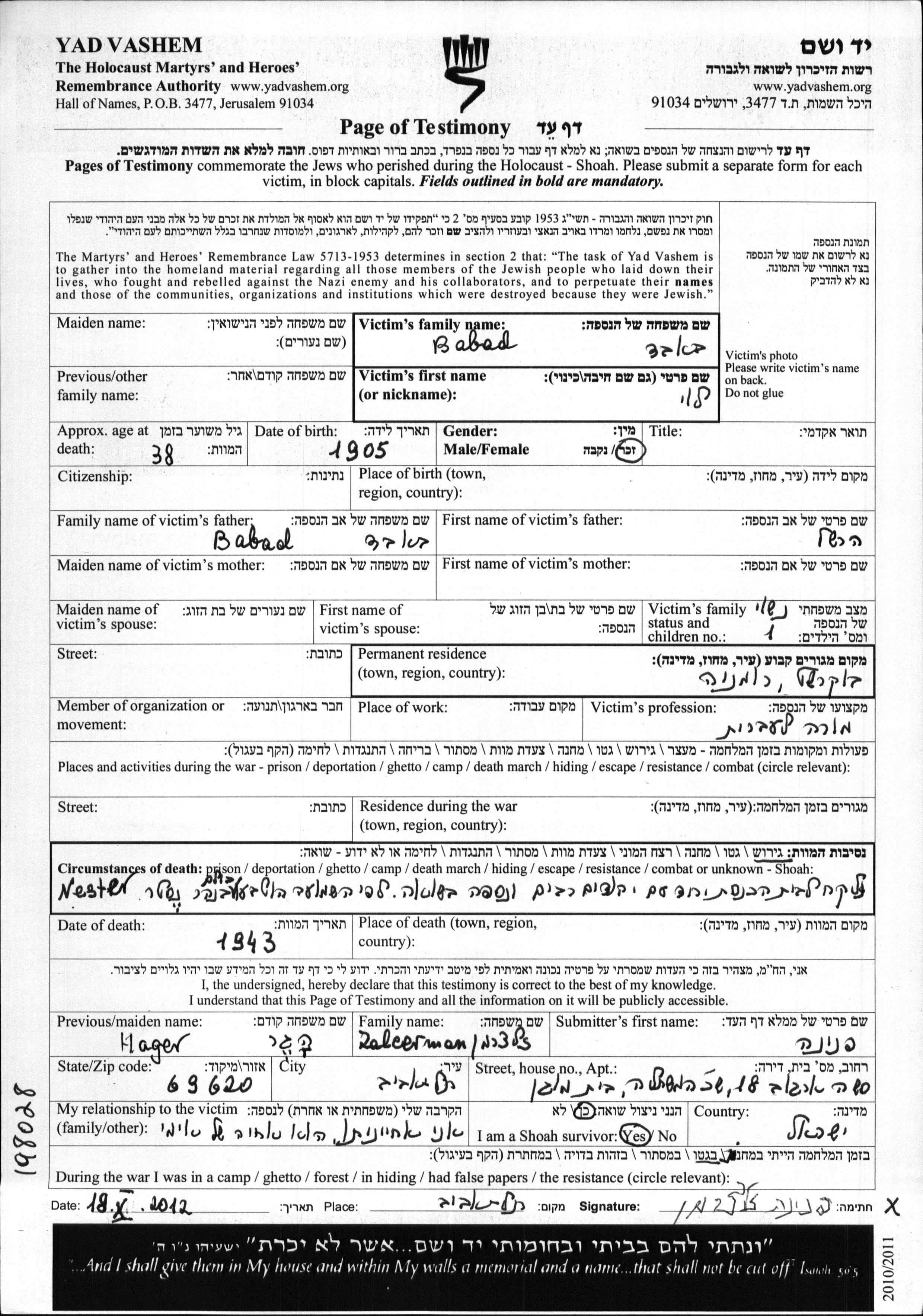 Yad Vashem - Pages of Testimony Names Memorial Collection