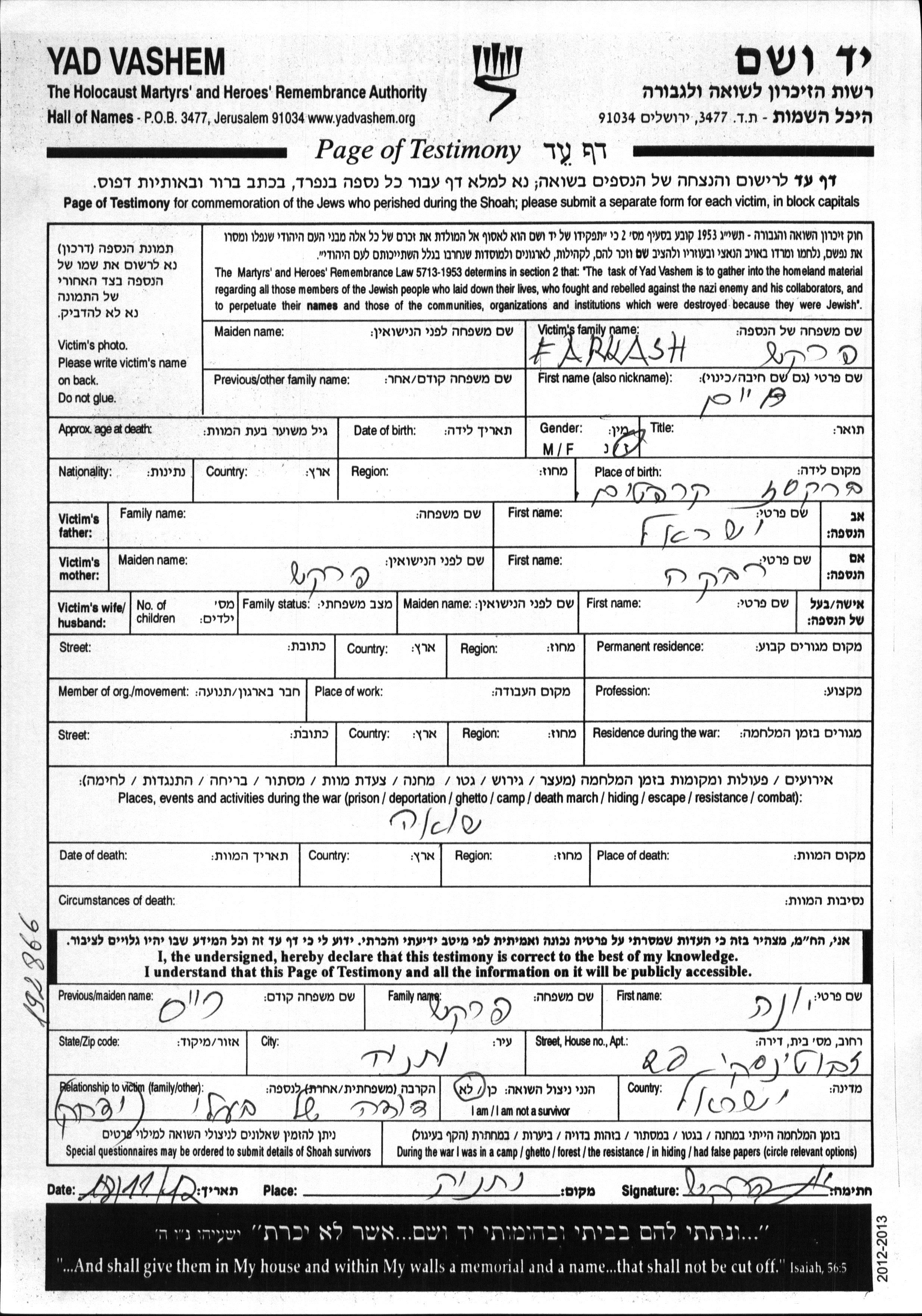 Yad Vashem - Pages of Testimony Names Memorial Collection