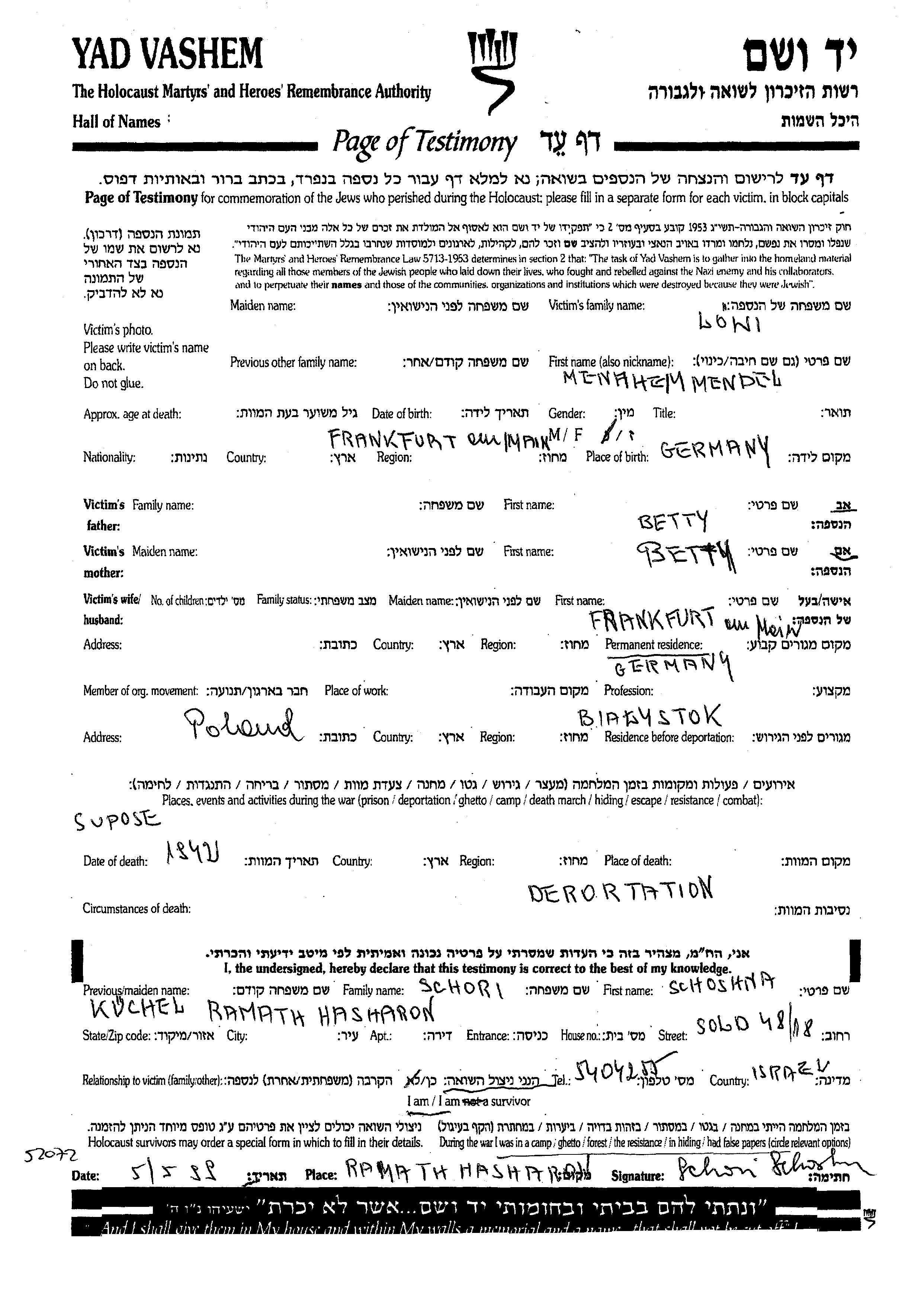 Lowi Menahem Mendel Allemagne Feuille de témoignage