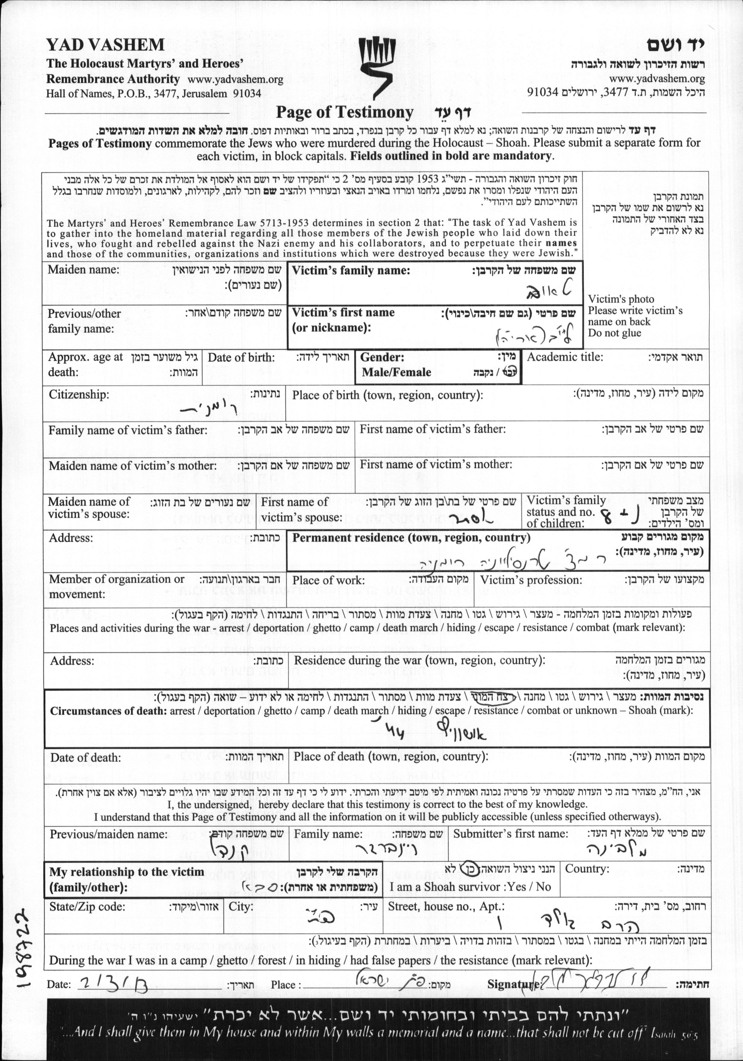 Yad Vashem - Pages of Testimony Names Memorial Collection