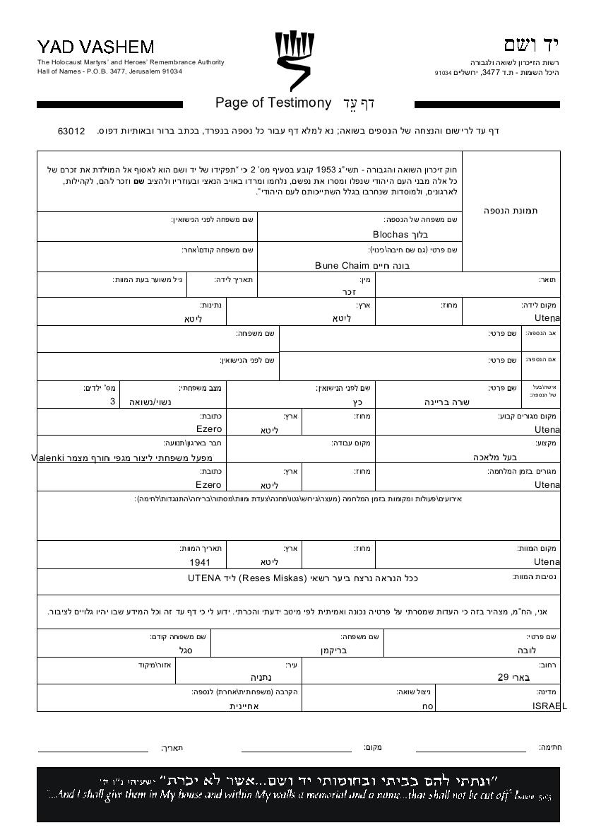 Blokh Buna Chaim Utena, Lituanie Feuille de témoignage (digitale)