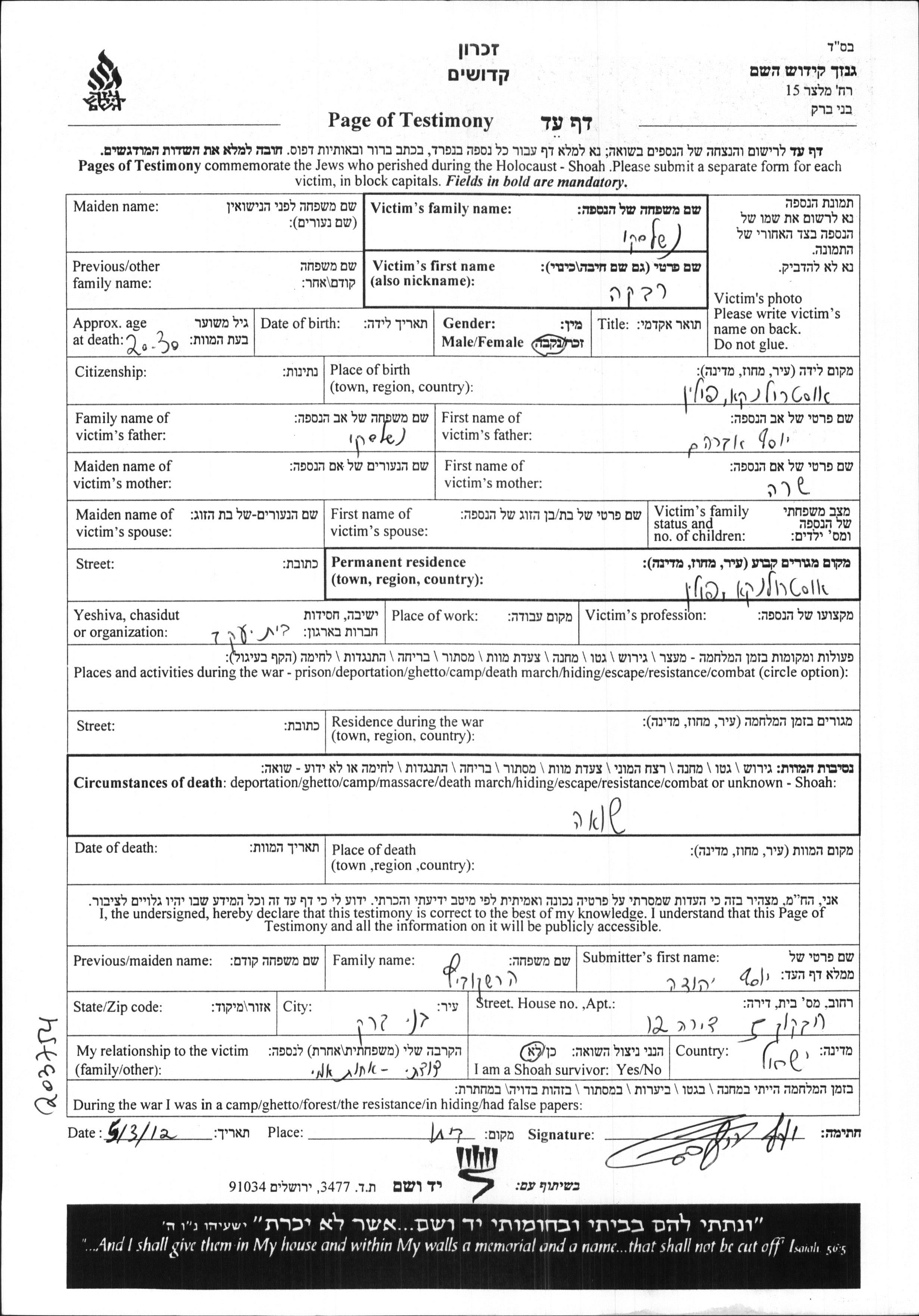 Recherche par date de la mort pendant la période de la Shoah: 1933-1945. Sélectionnez 'Exact'; dans la liste pour rechercher l'année exacte, ou sélectionner '+/- 2 ans'; ou '+/- 5 ans