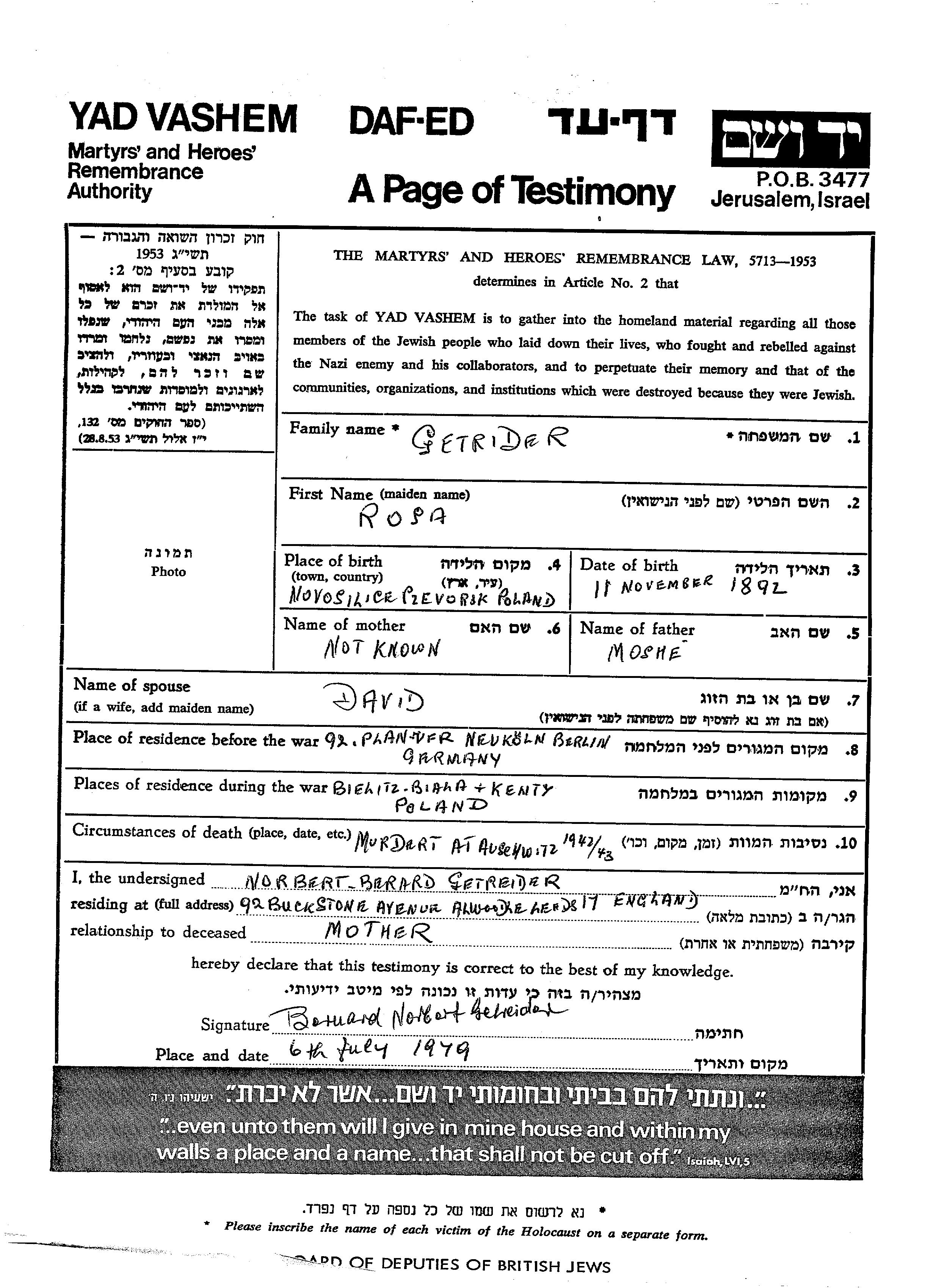 Rosa Getrider est née à Nowosielce, Pologne en 1892, fille de Moshe. Elle était Mariée à David. Avant la seconde guerre mondiale elle vivait à Berlin, Allemagne. Pendant la guerre, elle était à Kenty, Pologne.