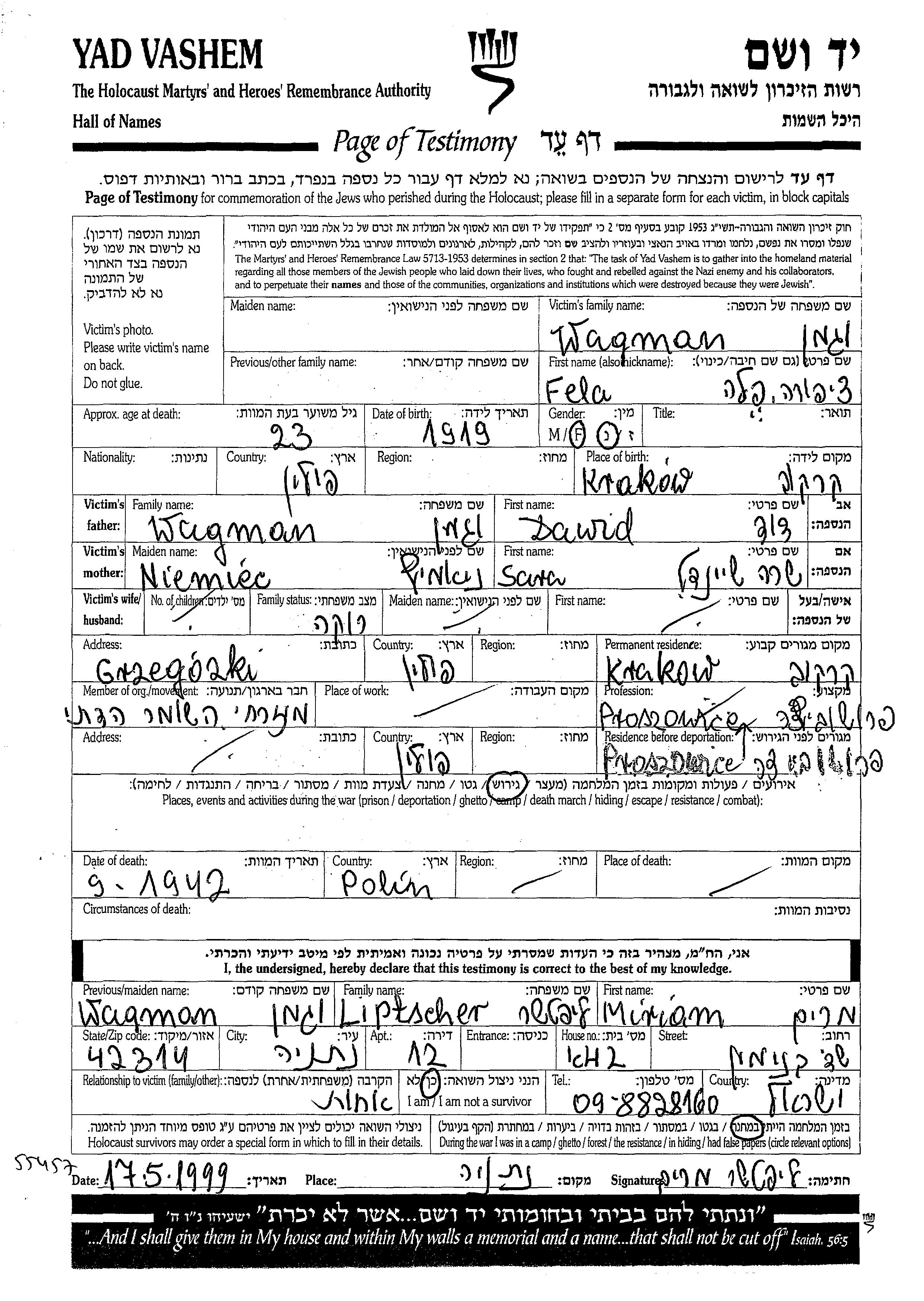 Wagman Fela Tzipora 1919 Krakow, Pologne Feuille de témoignage