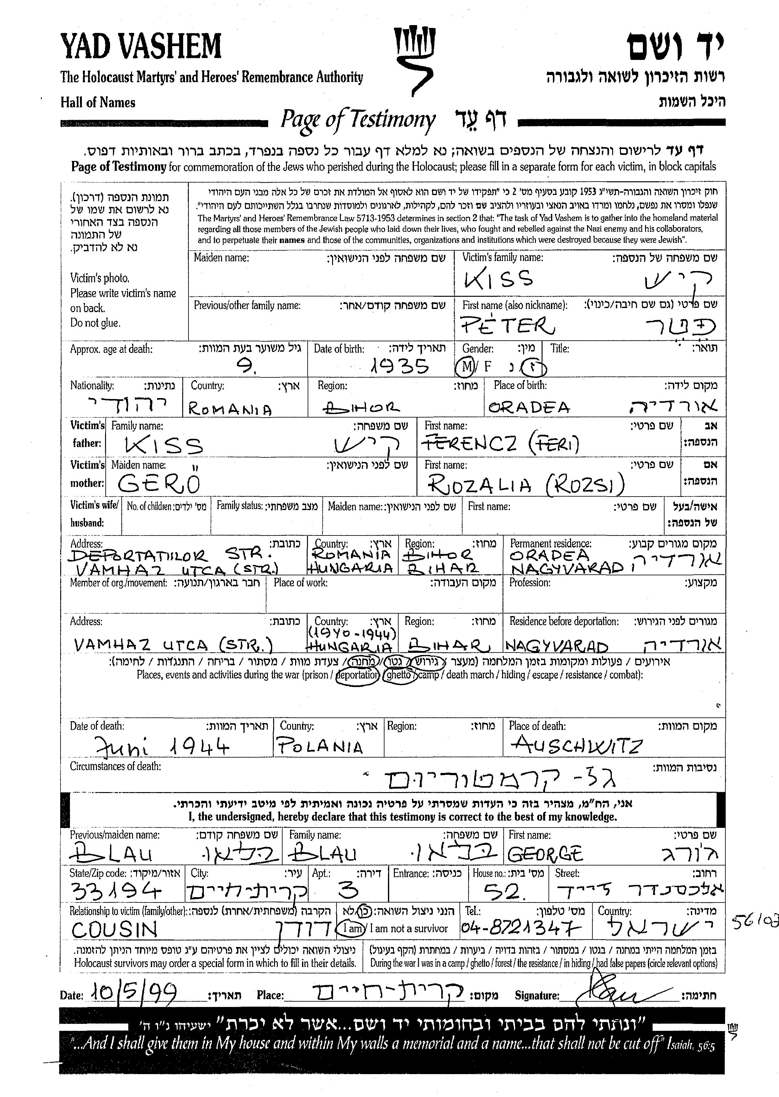Kiss Peter 1935 Oradea, Roumanie Feuille de témoignage
