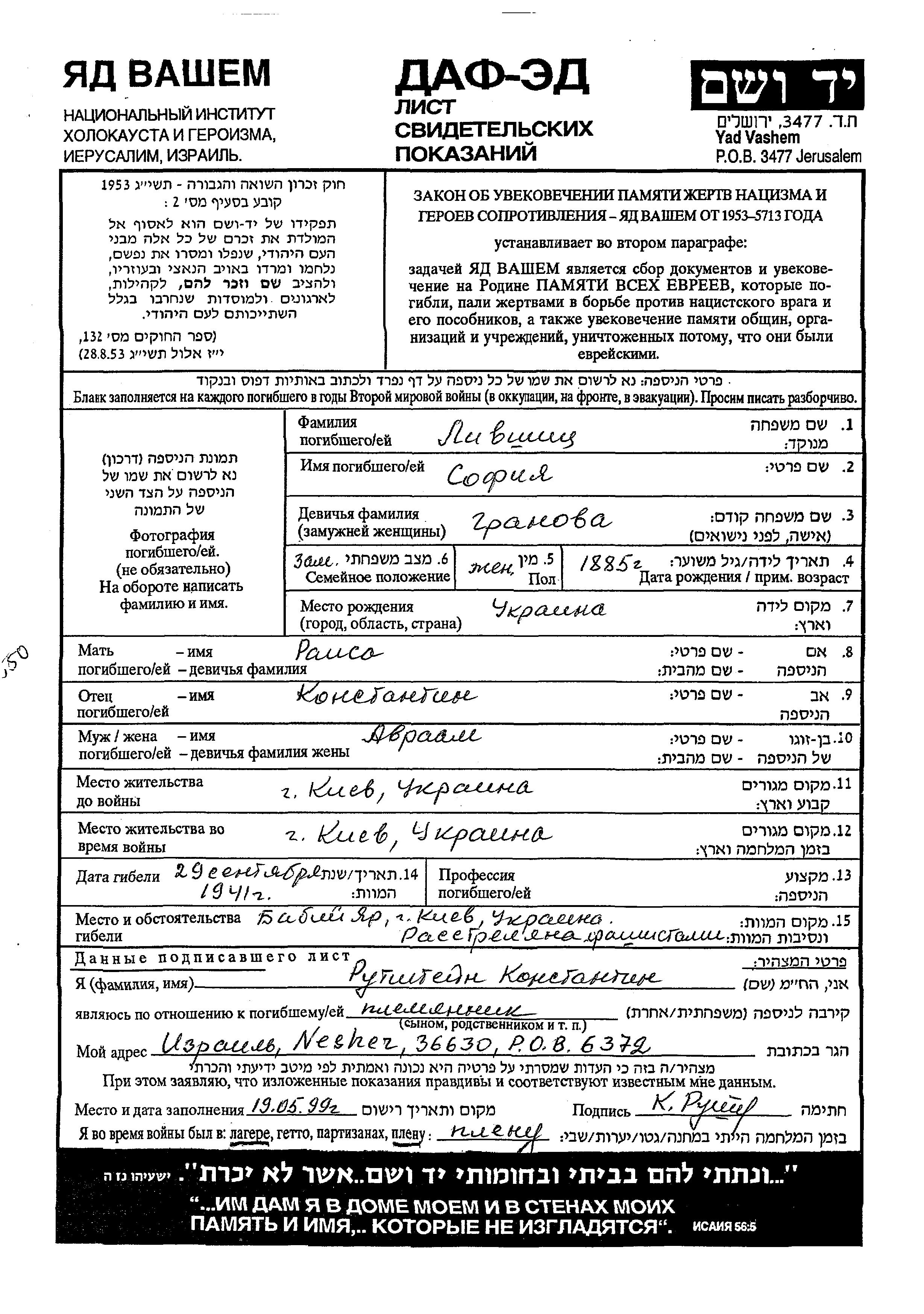 Livshitz Sofiya 1885 Kiyev, Ukraine (URSS) Feuille de témoignage