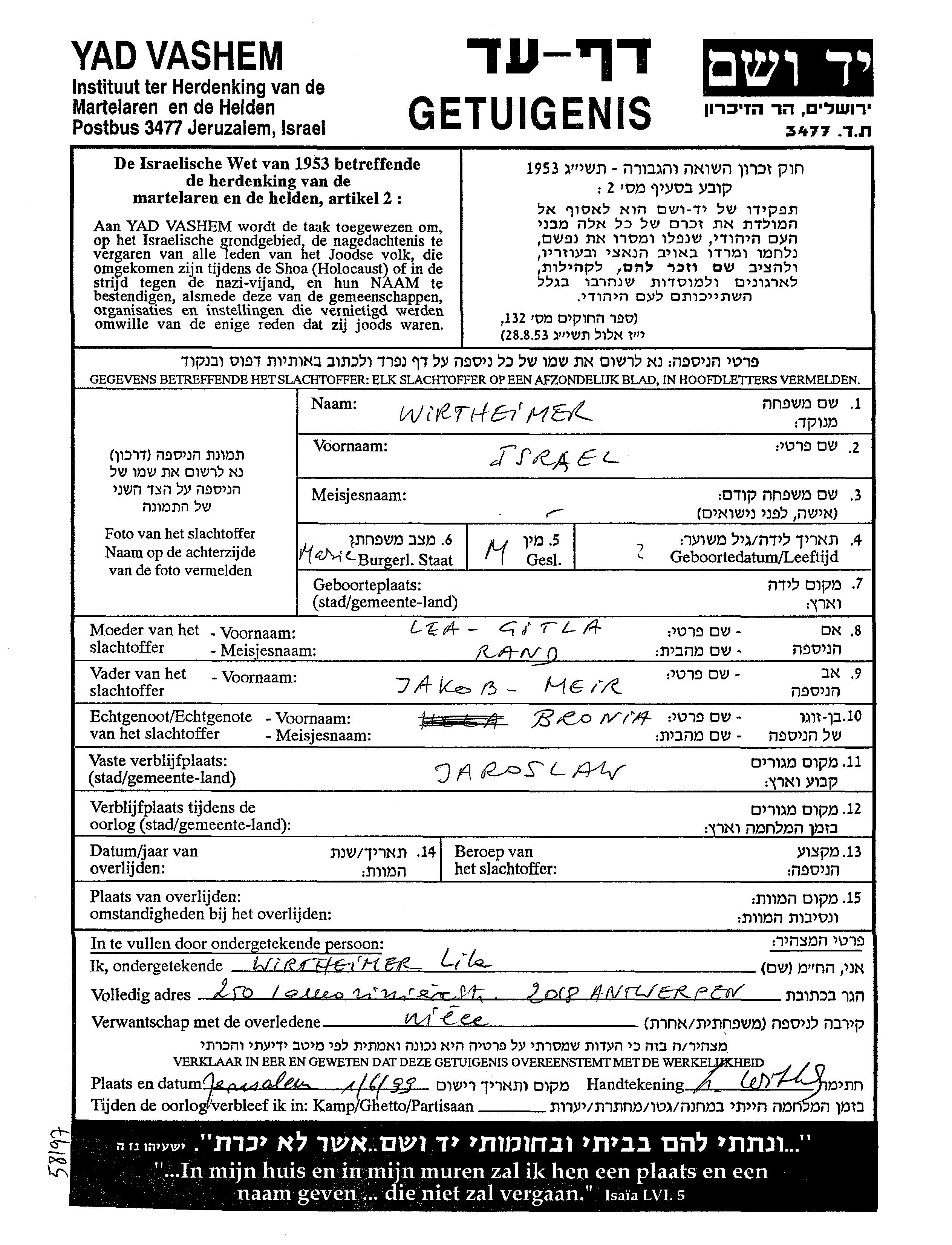 Wirtheimer Israel Jaroslaw, Pologne Feuille de témoignage