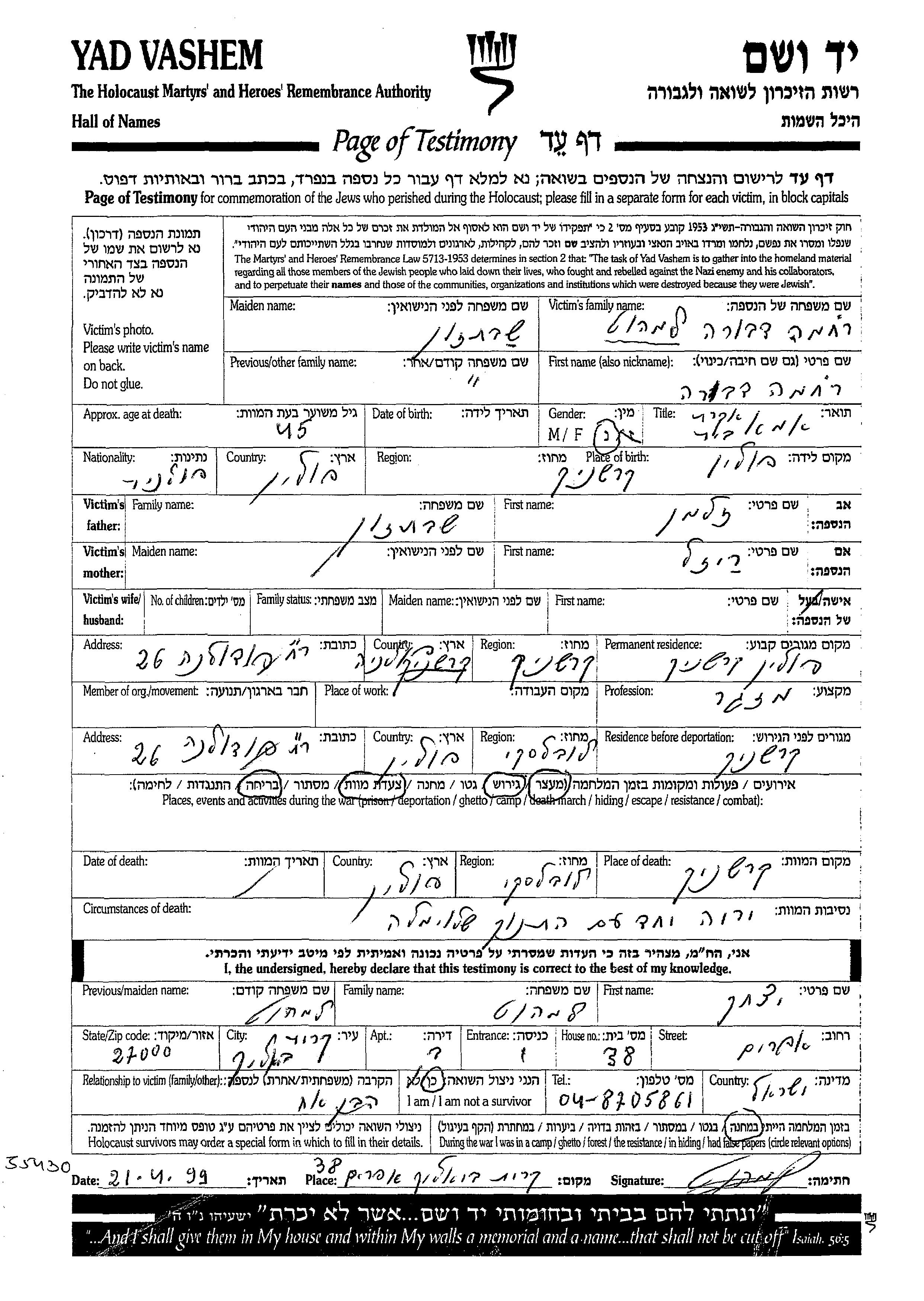 Yad Vashem - Pages of Testimony Names Memorial Collection