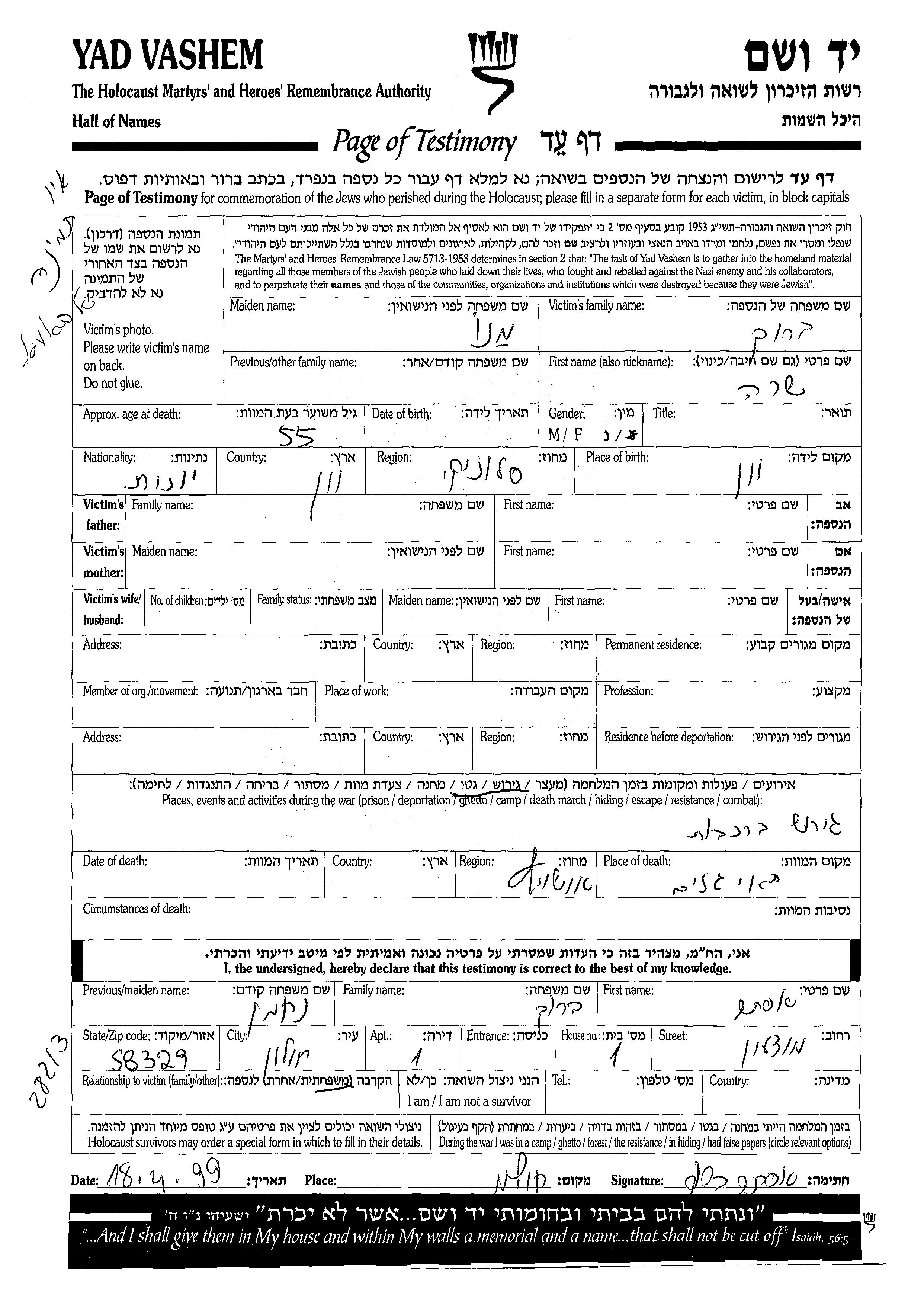 Yad Vashem - Pages of Testimony Names Memorial Collection