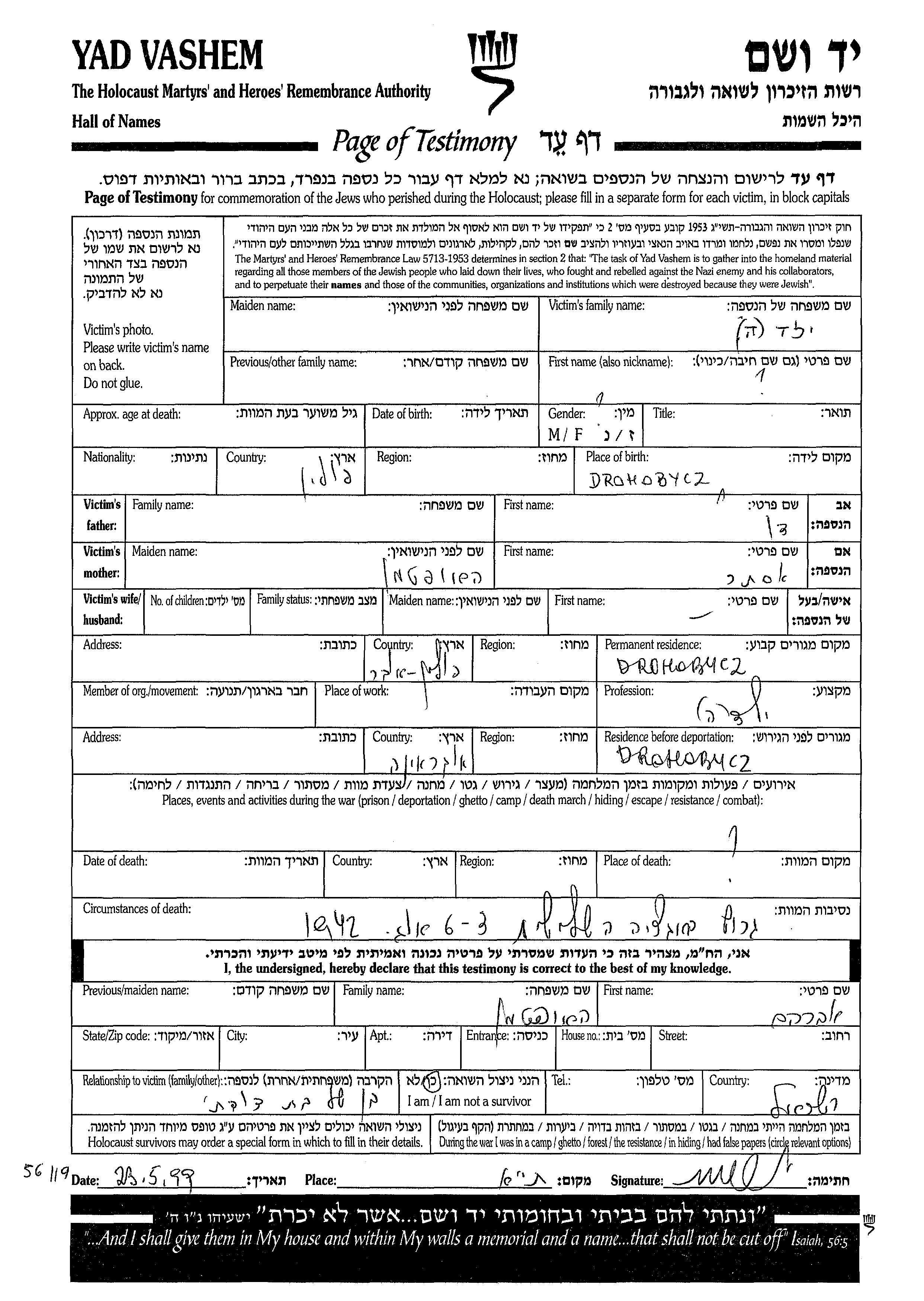 nom inconnu prénom inconnu Drohobycz, Pologne Feuille de témoignage