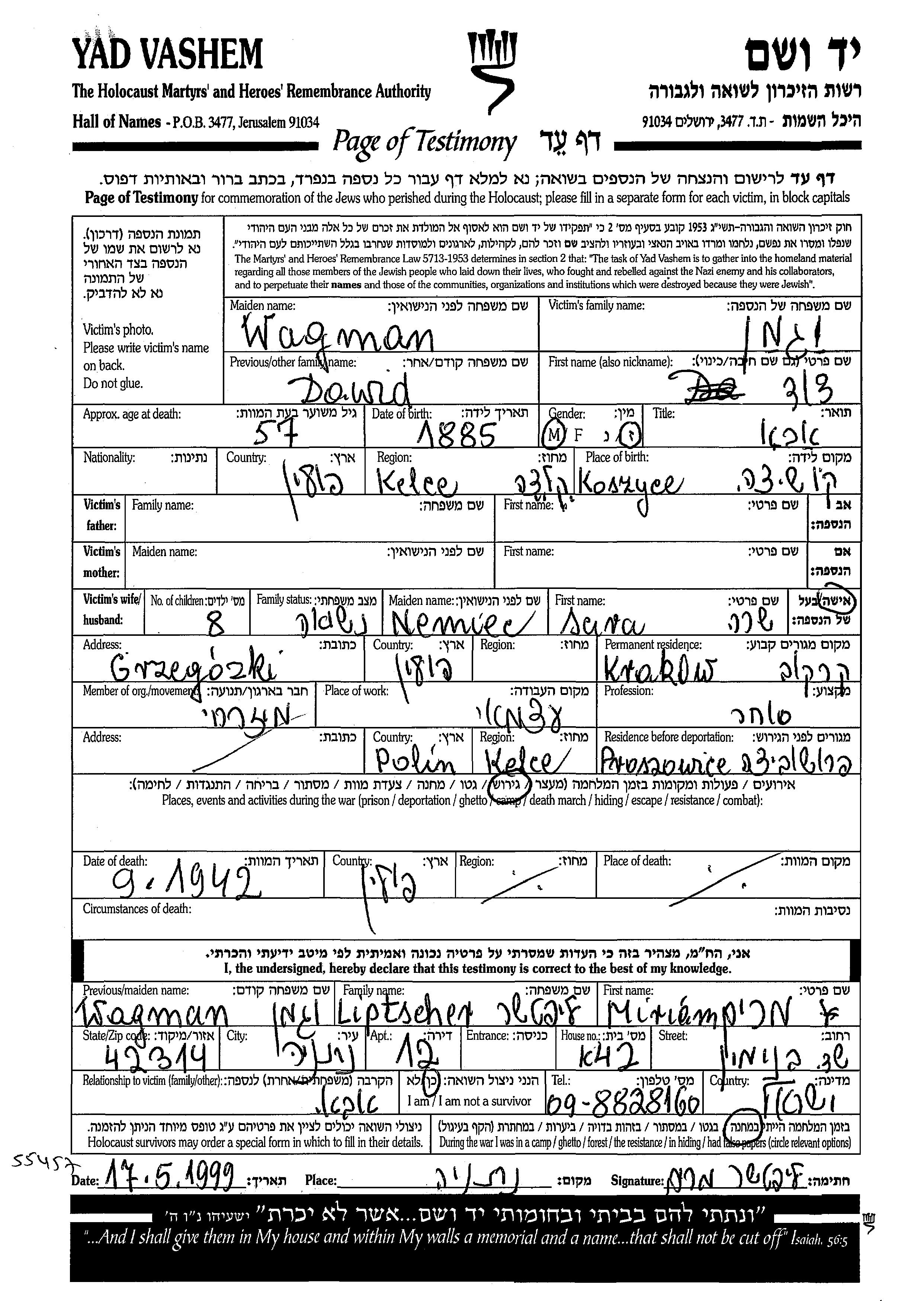 Wagman Dawid 1885 Krakow, Pologne Feuille de témoignage
