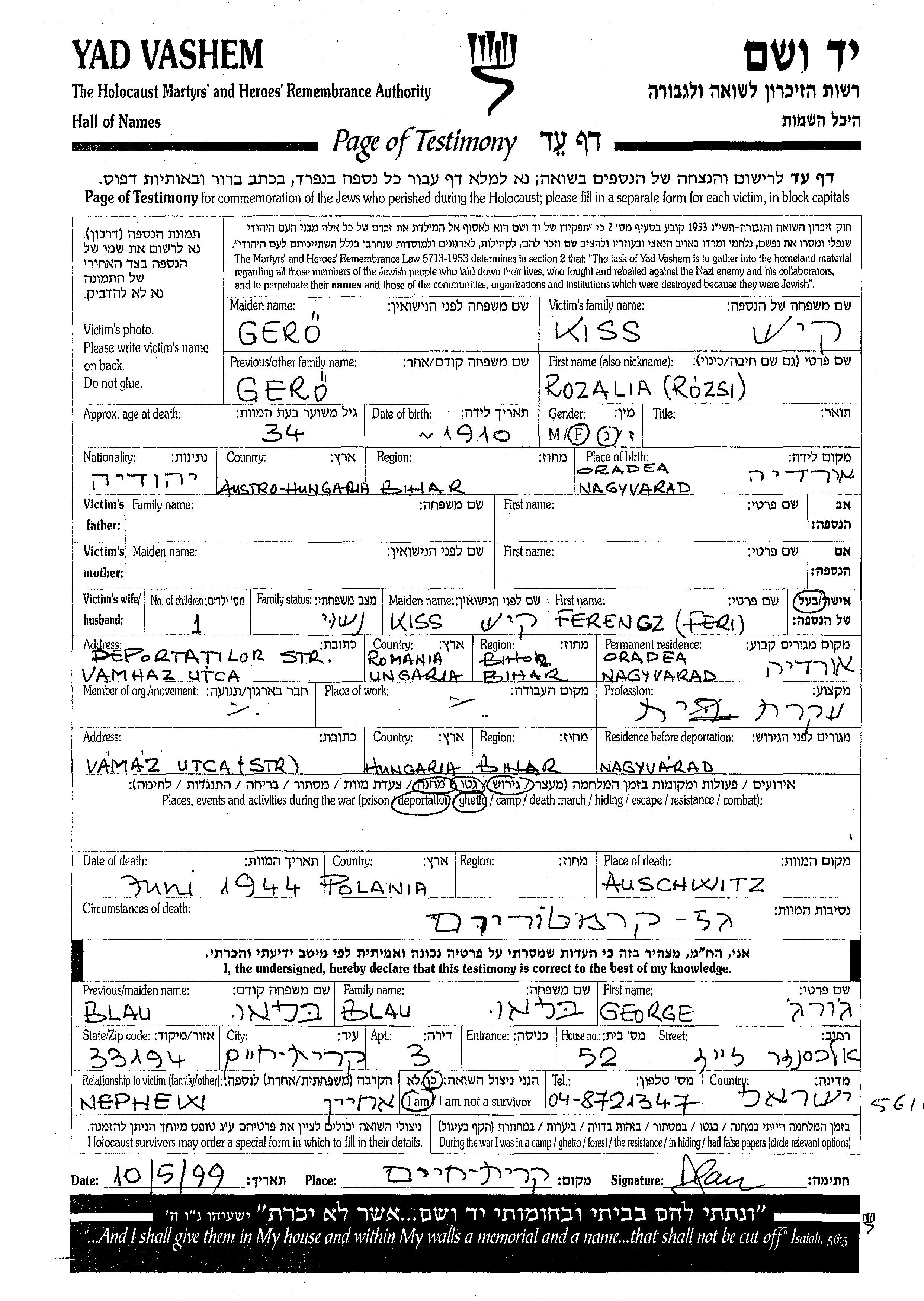 Rozalia Kiss née Gero est née à Oradea, Roumanie en 1910. Elle était Femme au foyer et Mariée à Ferencz. Avant la seconde guerre mondiale elle vivait à Oradea, Roumanie. Pendant la guerre, elle était à Oradea, Roumanie.